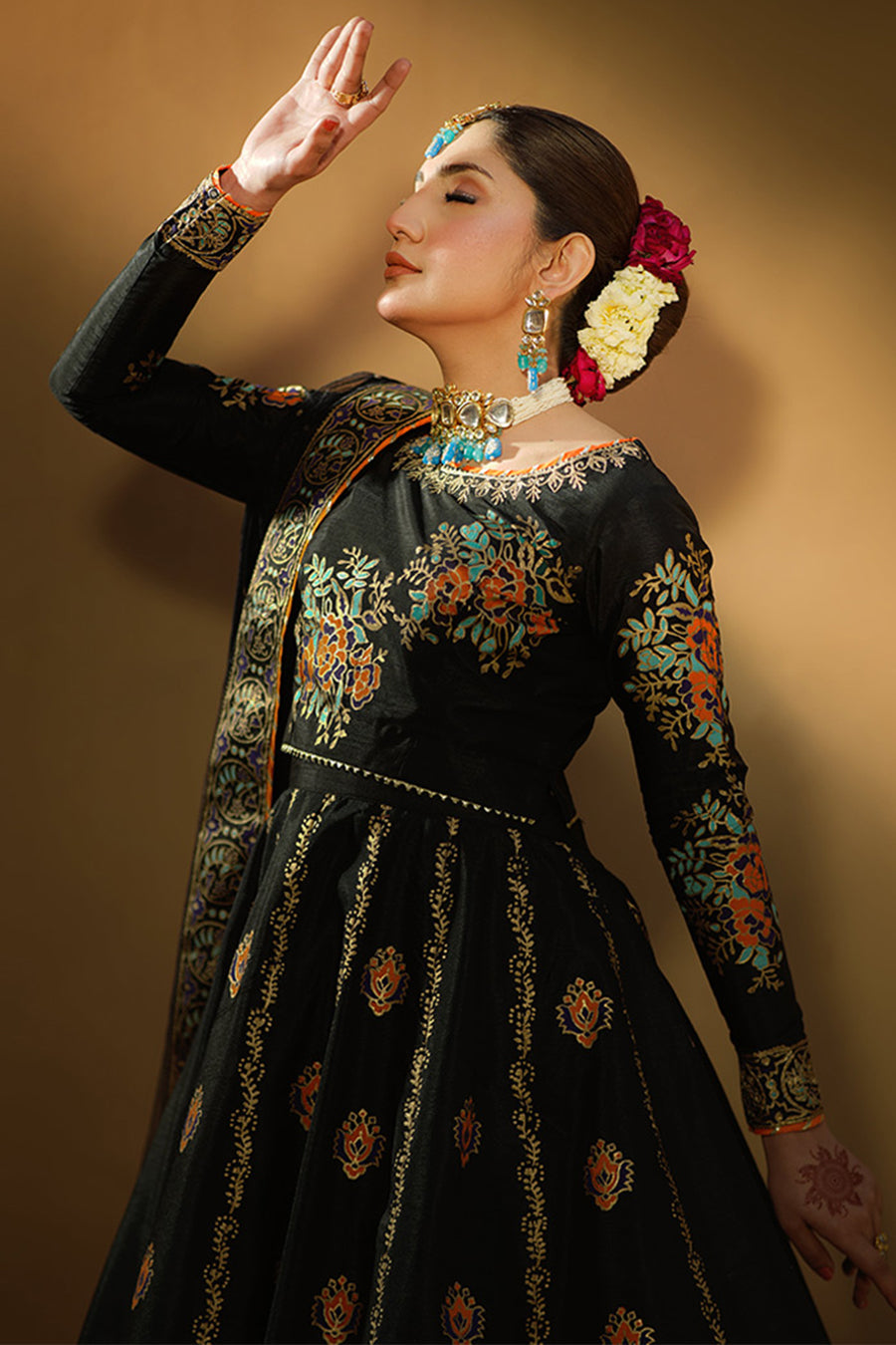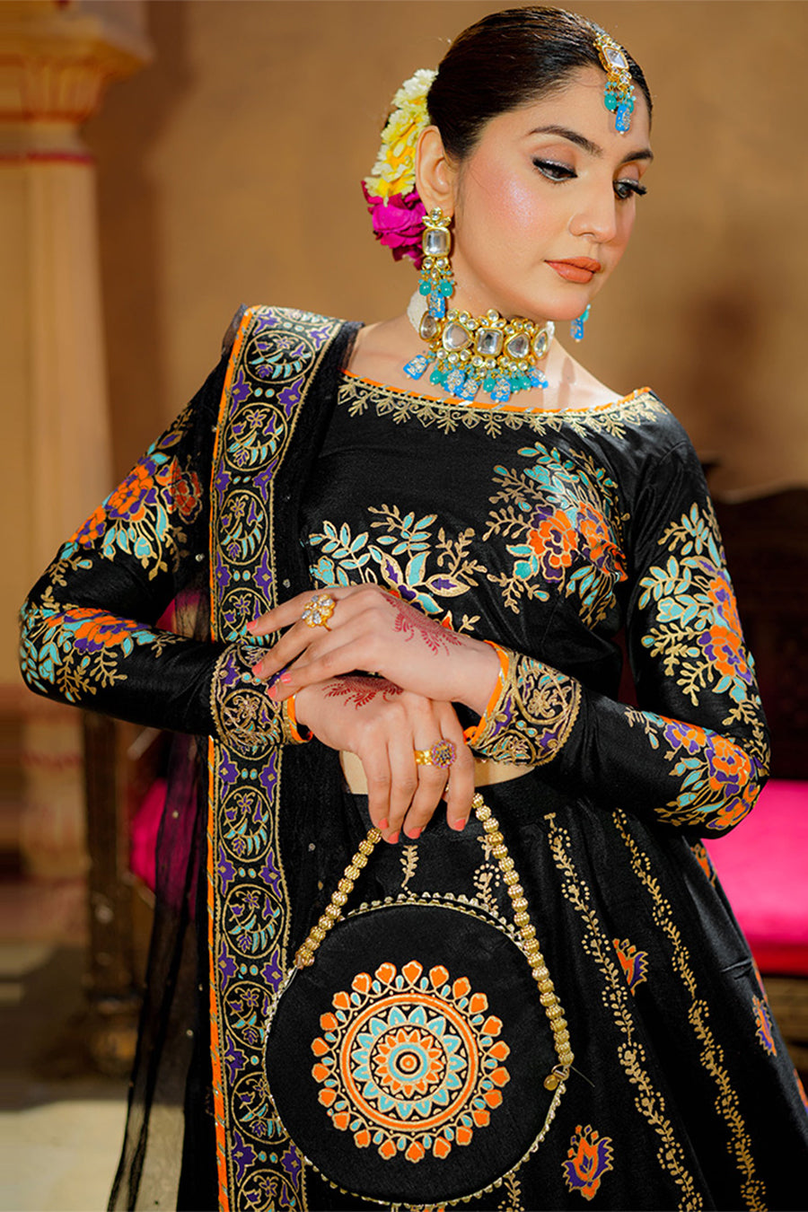 ‘DIYA’ Step into elegance with this stunning black dress ‘DIYA’! Made from luxurious raw silk, it features exquisite machine tilla embroidery on the neckline and sleeves, created using the hand block technique. The hand block print on the lehenga flare adds a touch of traditional charm. Cancan attached for nice volume. The gotta lace on the choli and lehenga flare beautifully complements the overall design. With a back zip adorned with tassels, it's both stylish and convenient. The cancan attached gives the lehenga flare a graceful volume. The net dupatta with stone details and printed border with gotta lace completes the ensemble perfectly. Plus, it comes with a separate pouch, making it ideal for weddings and festive occasions. This dress will make you the center of attention. Shine bright and make a statement with this gorgeous black dress!" #Diya #GulPosh #EasternFusion #EmbrioderyDetails #HandBlockPrinting