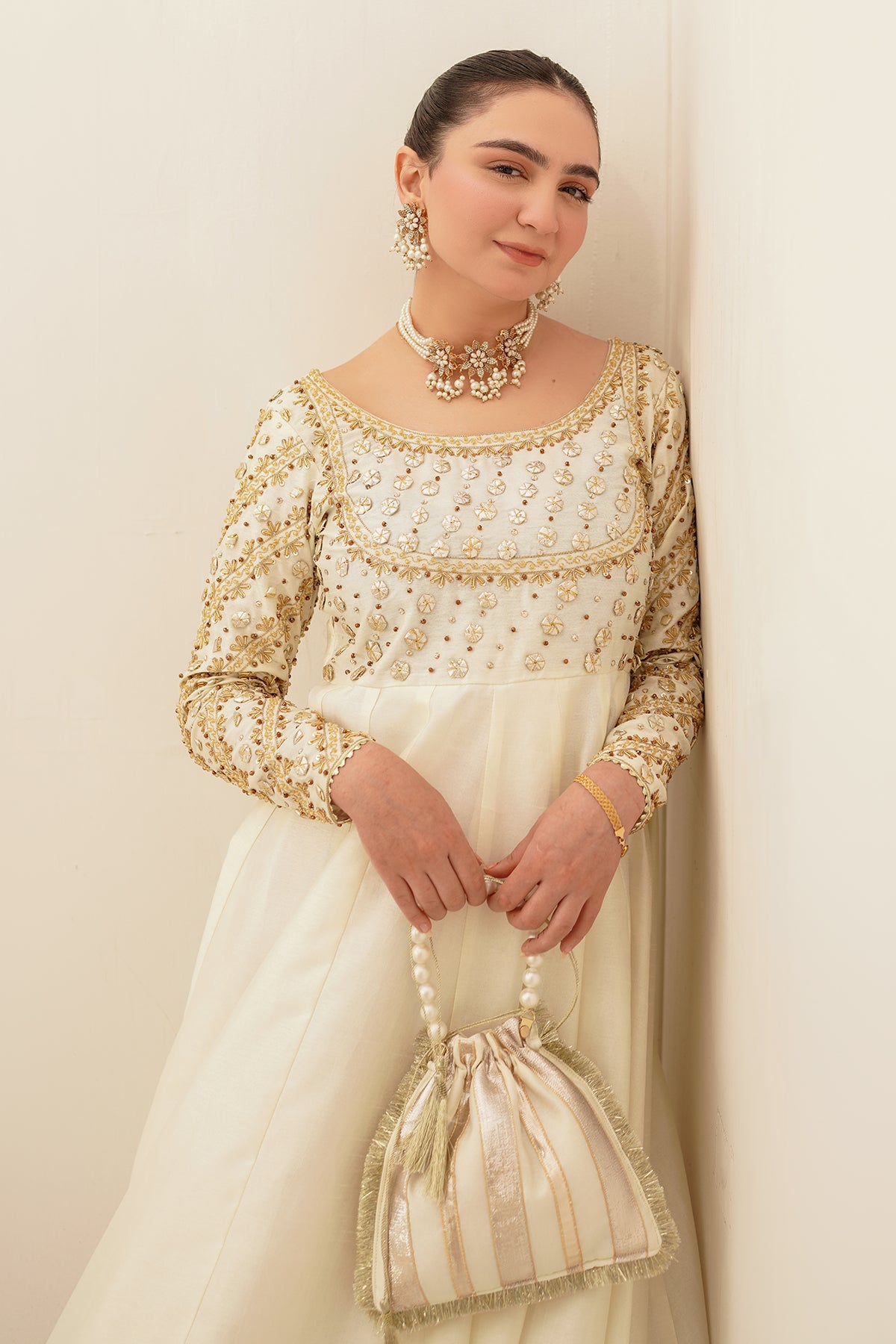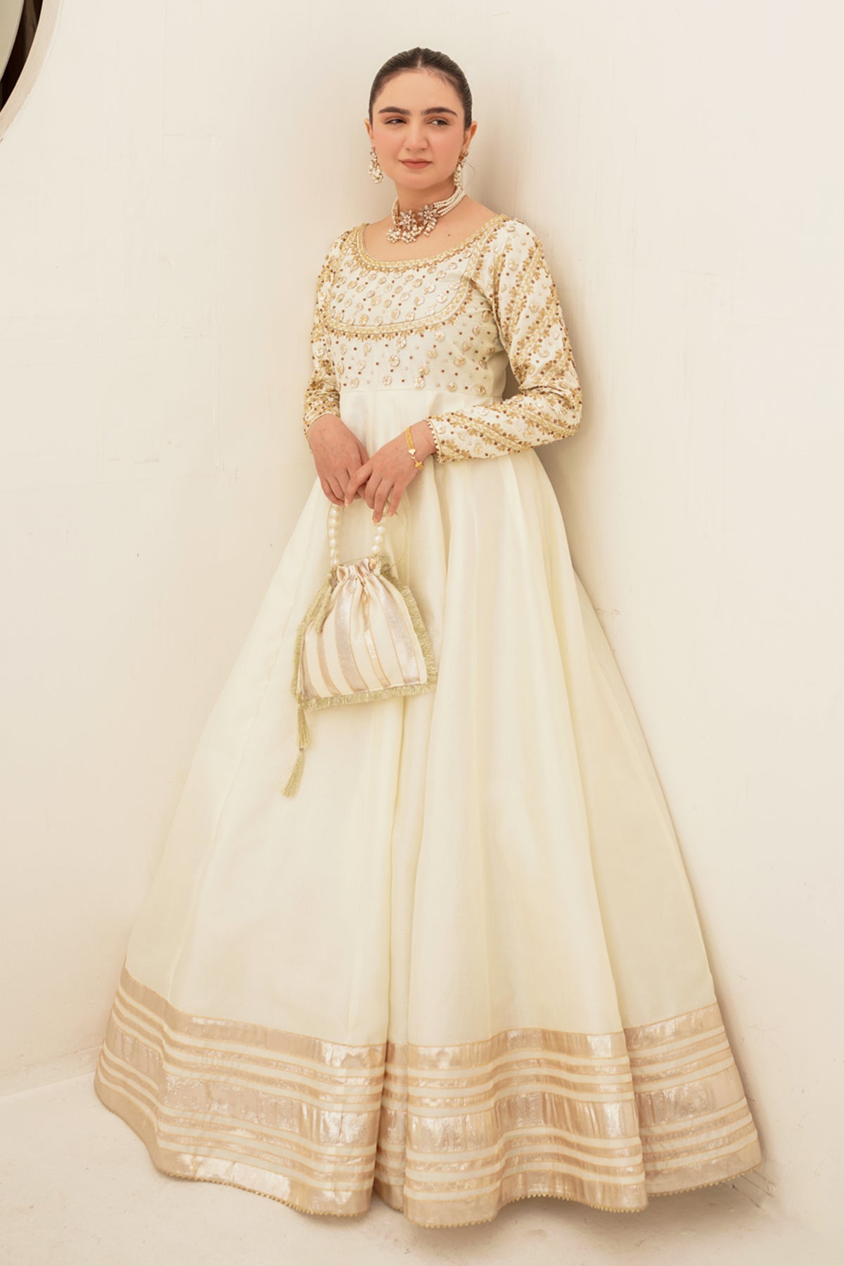 The 16-panel maxi features intricate handwork, gotta, and lappa detailing with a grand 240-inch flare finished with lappa work all around. The look is paired with a 3-yard net dupatta and charming tassels at the back. A matching potli is also available to complete the look.