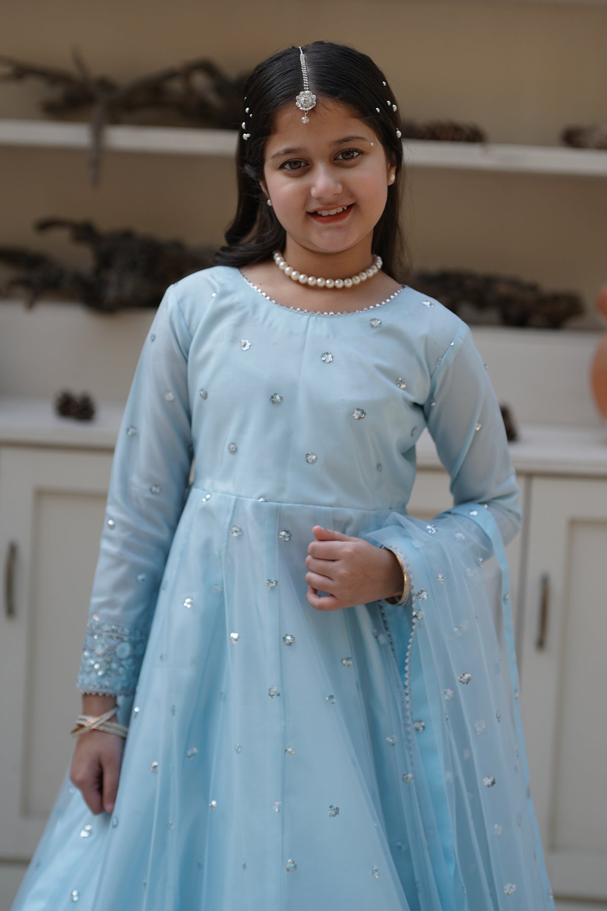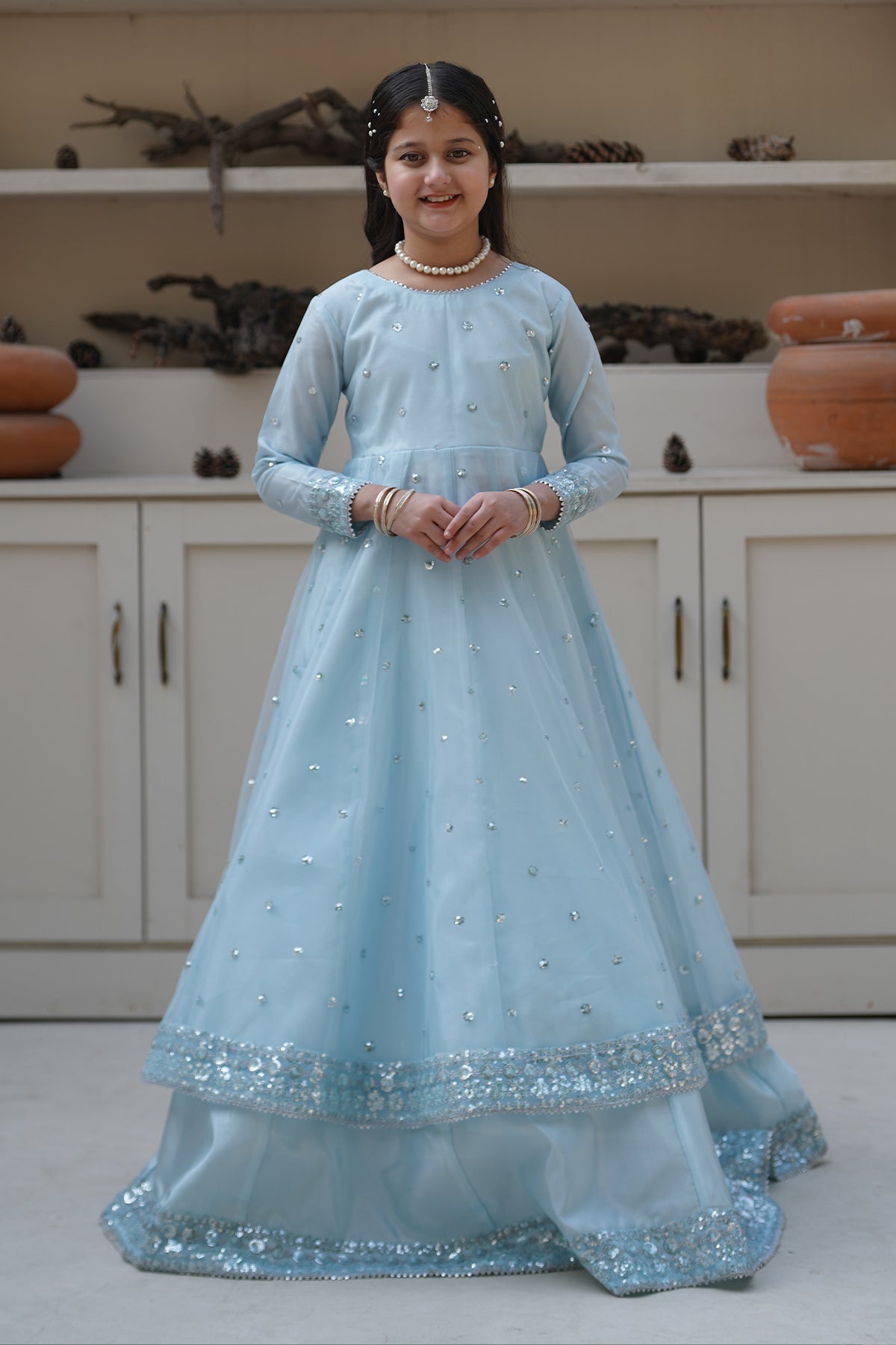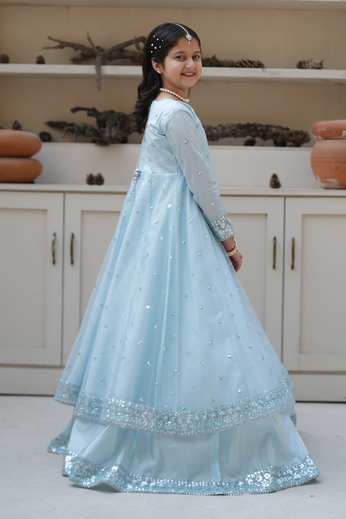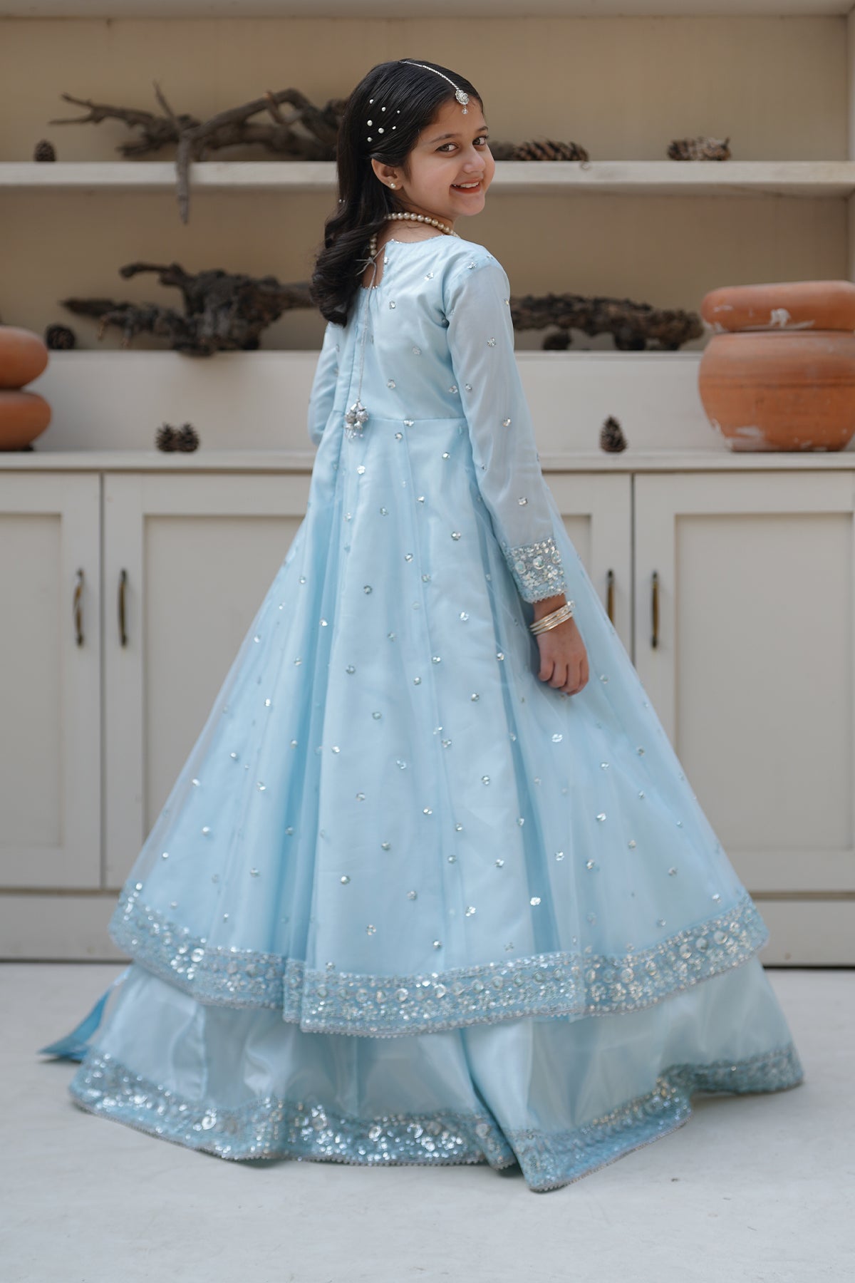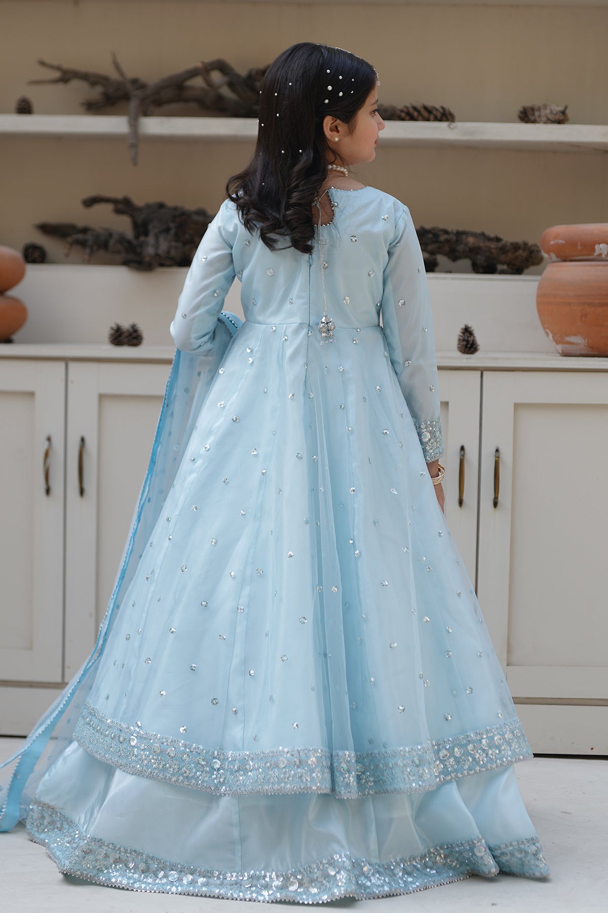 From the VASL collection, Mini Aafreen is an elegant panel frock made with premium Silk and breeze net.