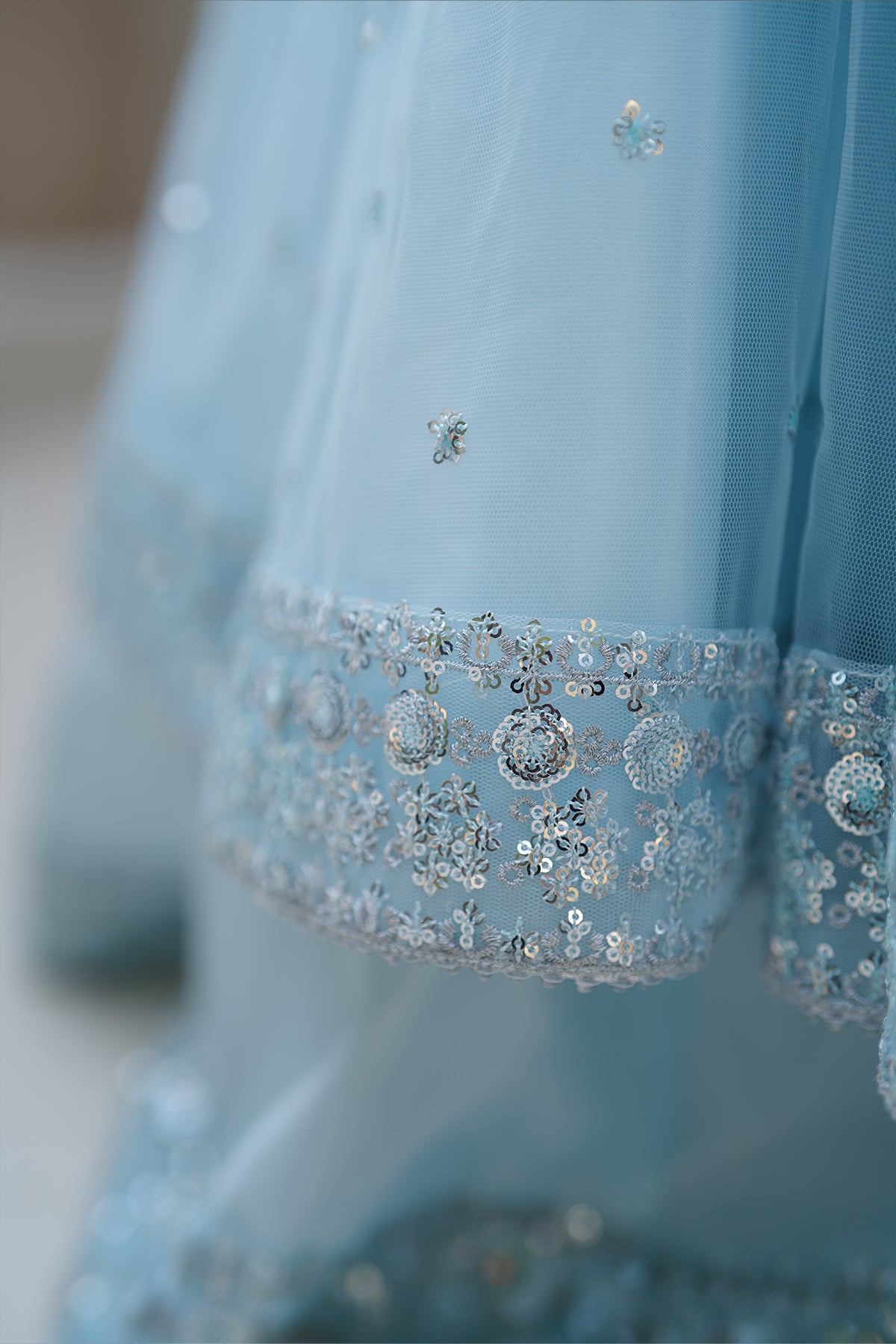 The 12-panel frock features intricate Embroidery, Tilla, and Sequins detailing with a grand  flare finished with Tilla embroidery, sequins and gota lace all around. The look is paired with a net dupatta and charming Tassels at the back. comes with 12 panel lehenga with embroidered border on lehenga flare. Cancan attached for heavy flare