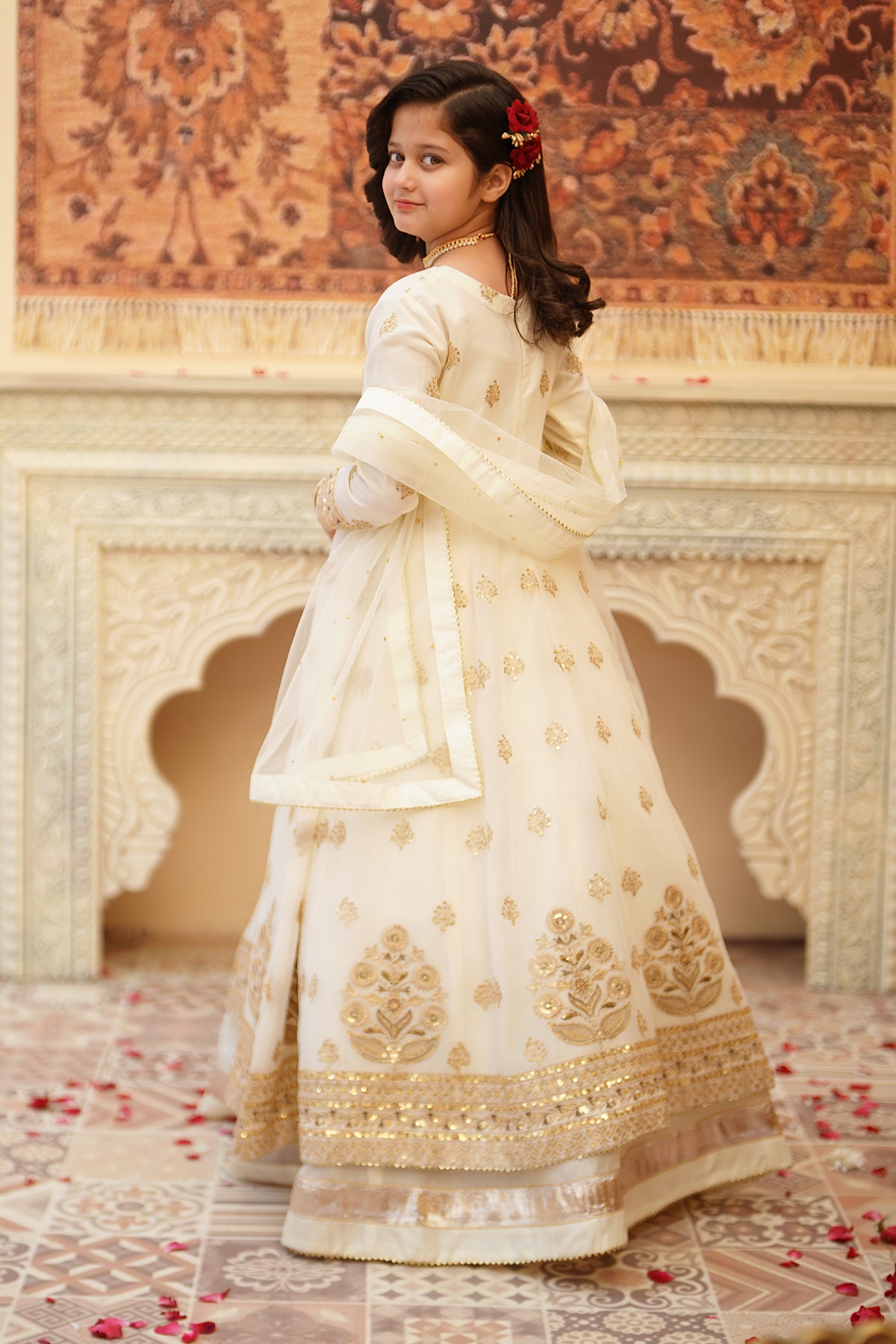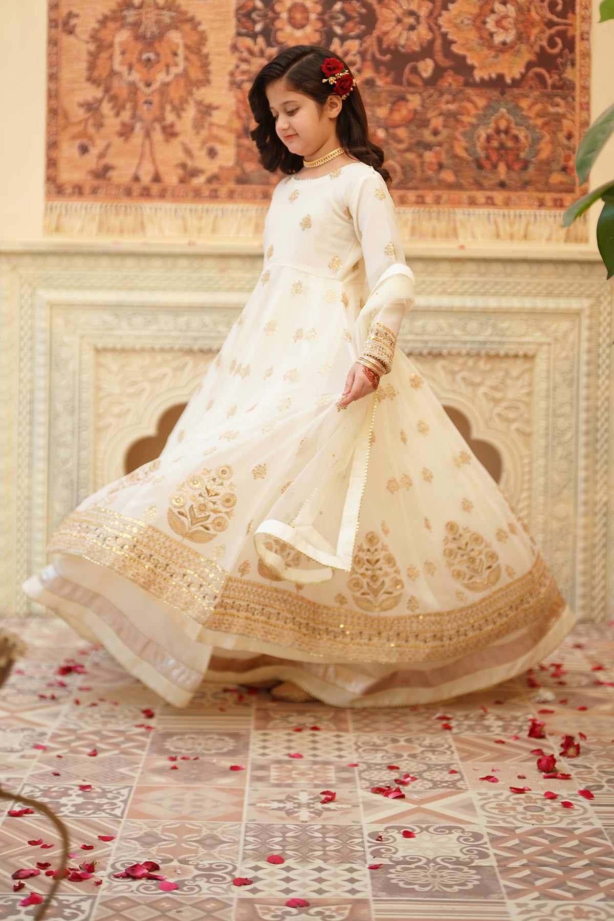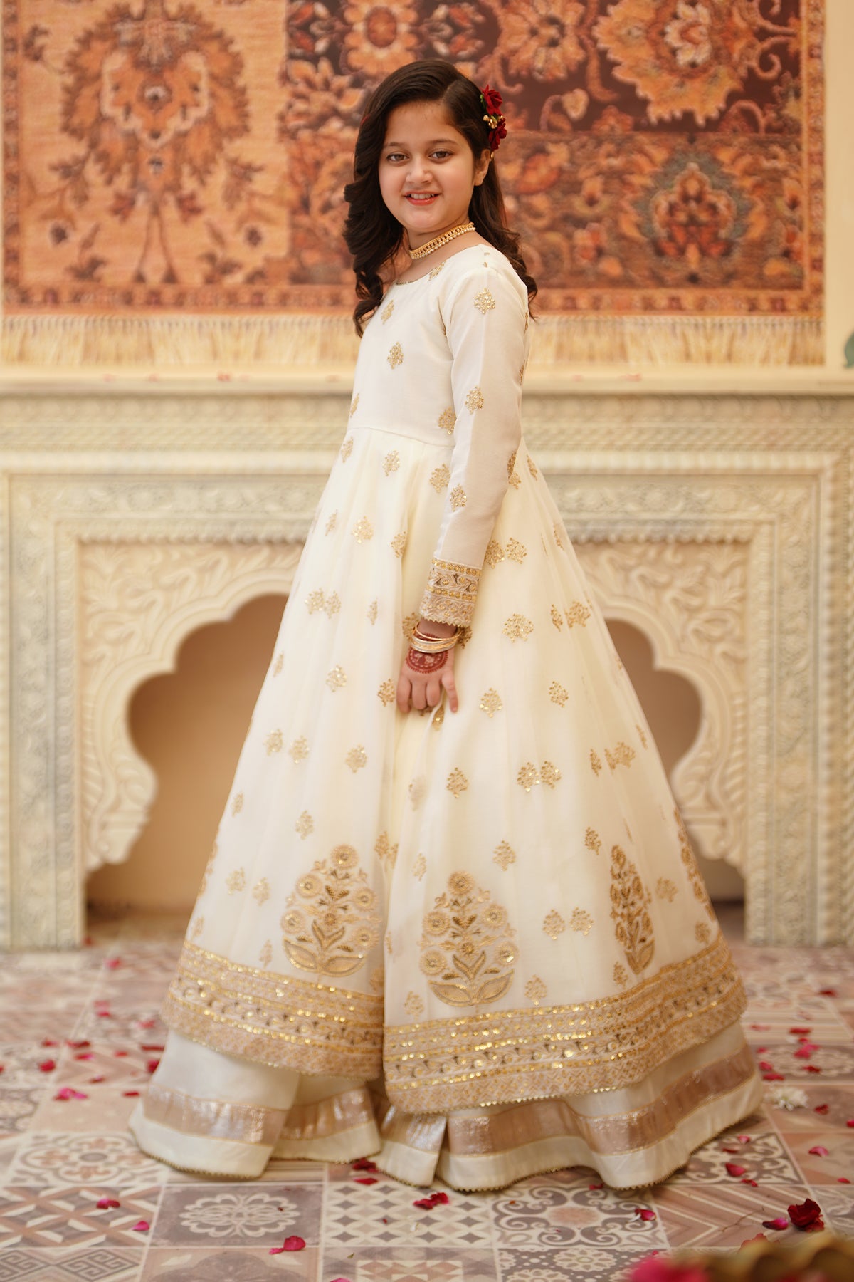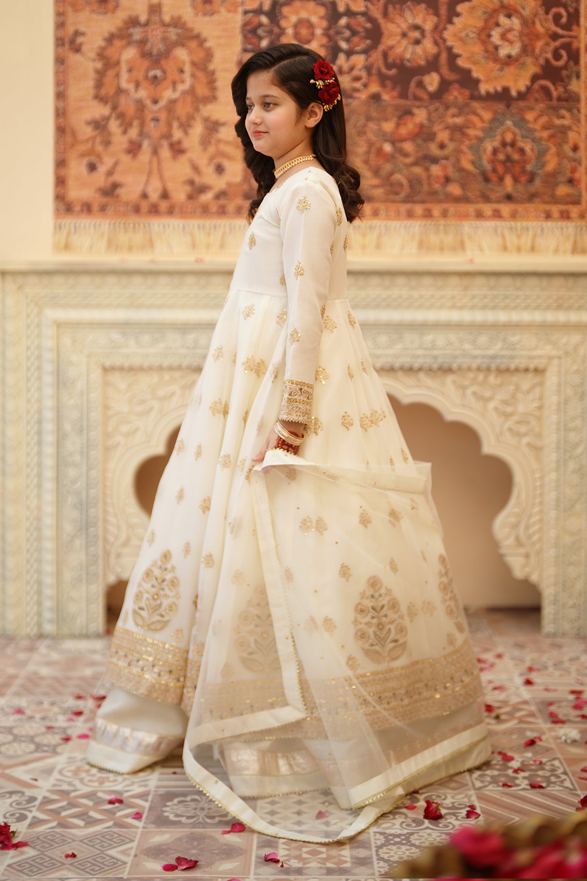 From the SHEHNAI collection, Mini CHAND is an elegant panel frock made with premium chiffon and silk. The 12-panel frock features intricate Embroidery, Tilla , and Sequins detailing with gota work all around. The look is paired with a net dupatta and charming Tassels at the back. It comes with 12 panel lehenga with lappa border on lehenga flare. Cancan attached for heavy flare.