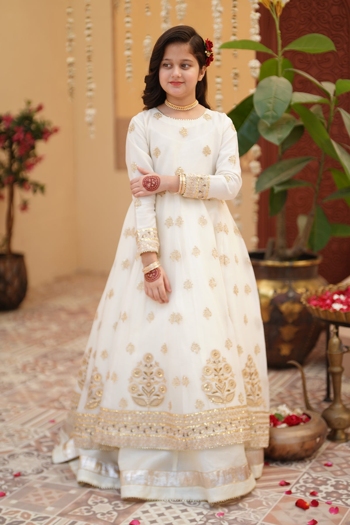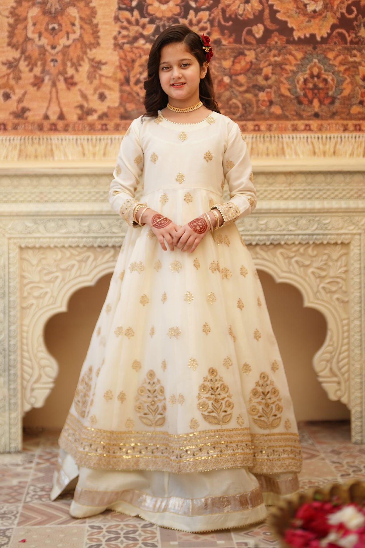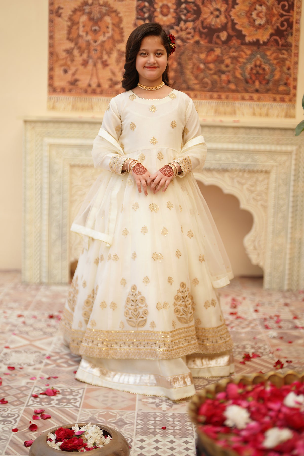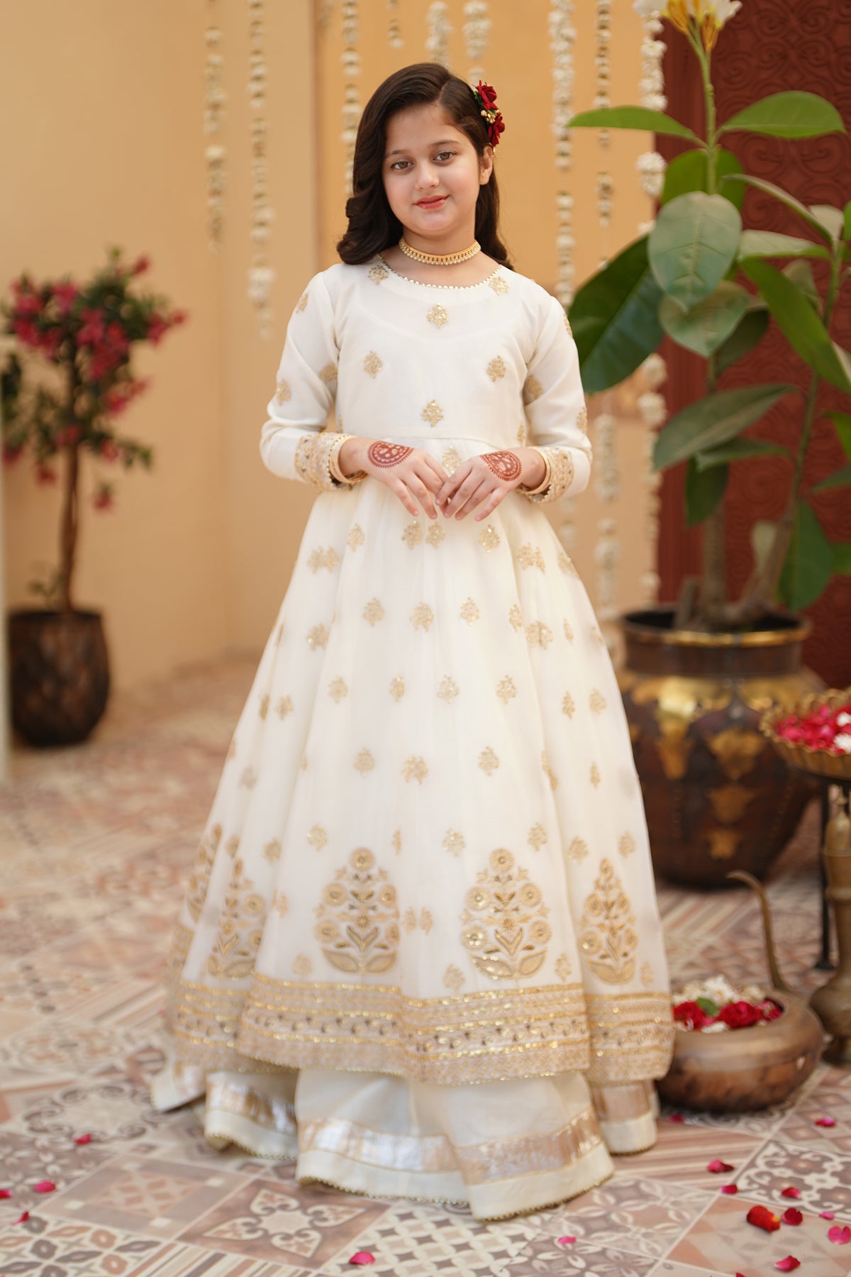 From the SHEHNAI collection, Mini CHAND is an elegant panel frock made with premium chiffon and silk. The 12-panel frock features intricate Embroidery, Tilla , and Sequins detailing with gota work all around. The look is paired with a net dupatta and charming Tassels at the back. It comes with 12 panel lehenga with lappa border on lehenga flare. Cancan attached for heavy flare.