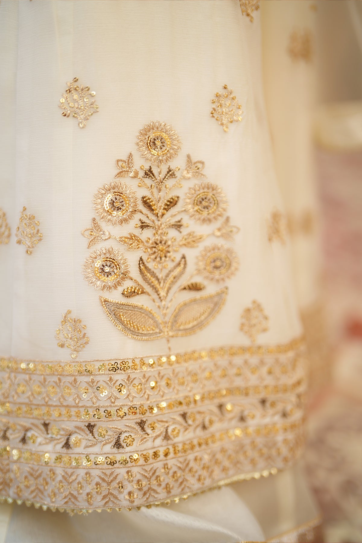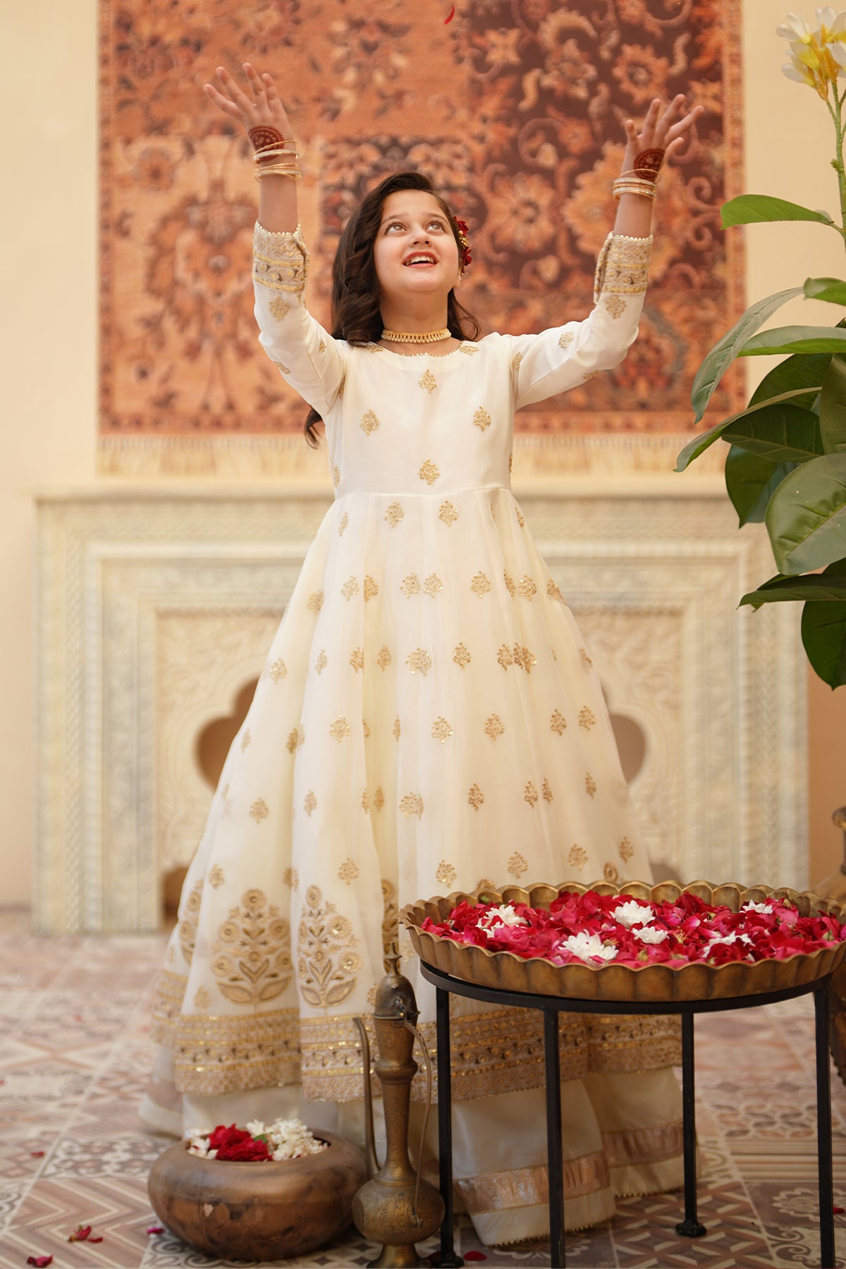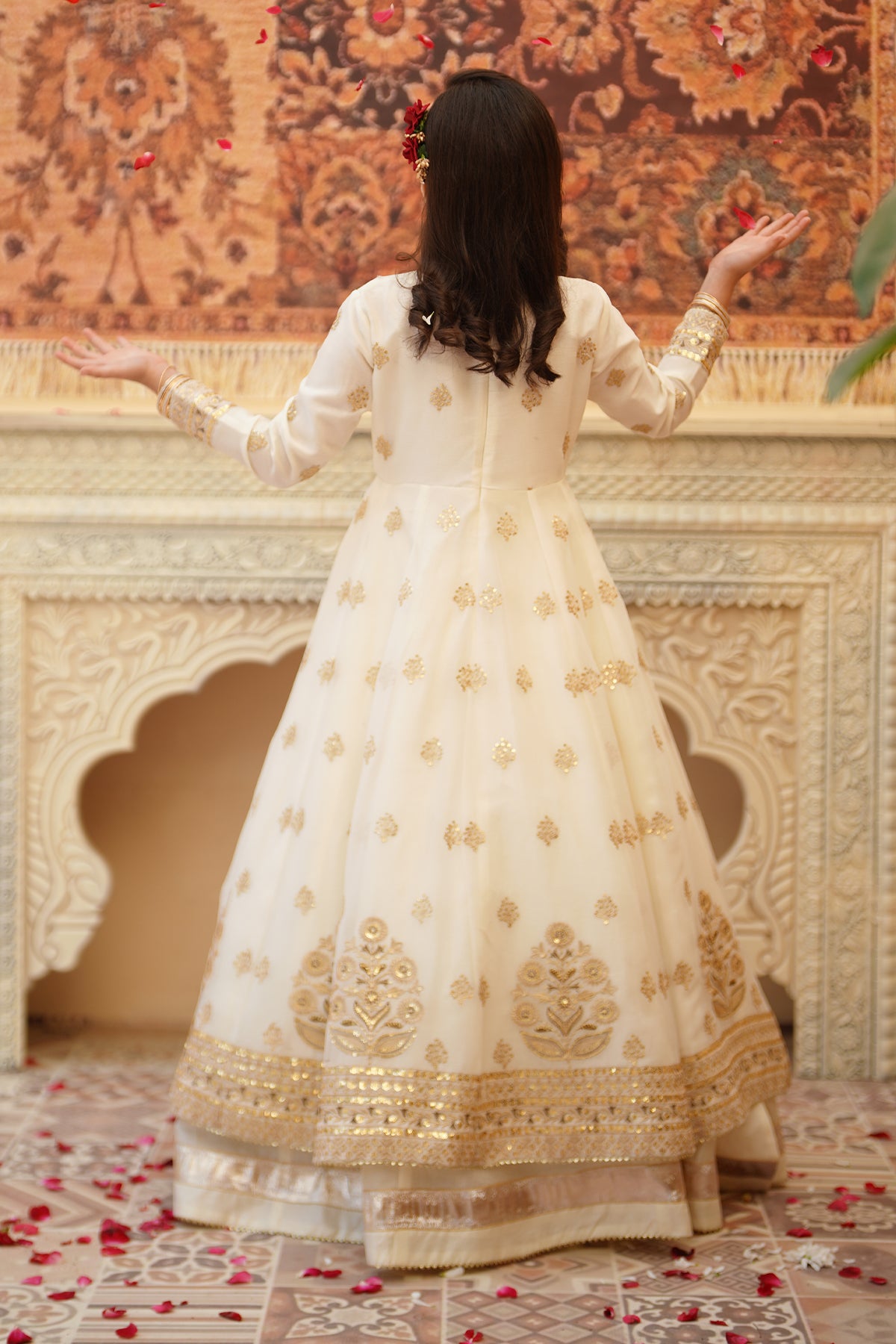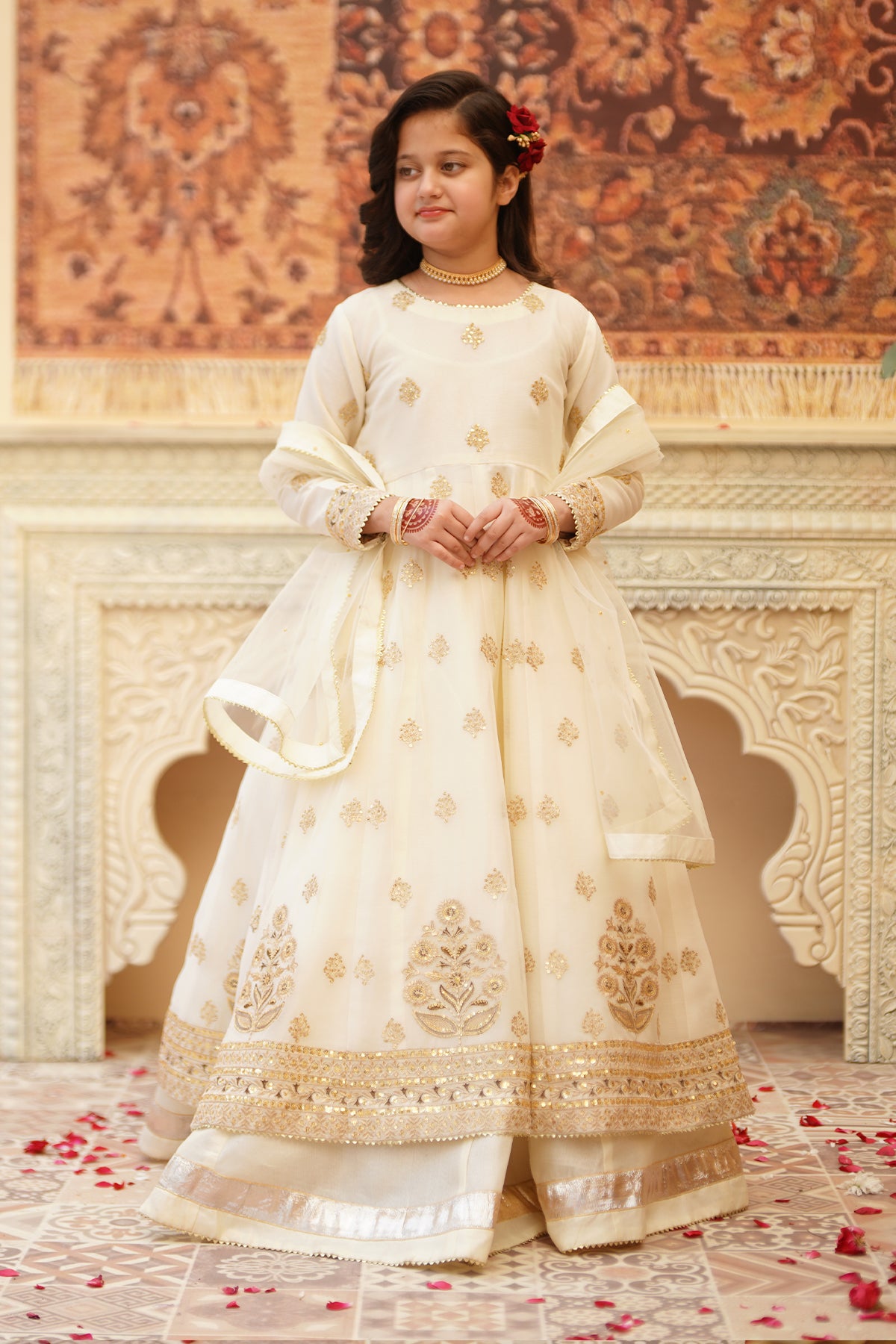 From the SHEHNAI collection, Mini CHAND is an elegant panel frock made with premium chiffon and silk. The 12-panel frock features intricate Embroidery, Tilla , and Sequins detailing with gota work all around. The look is paired with a net dupatta and charming Tassels at the back. It comes with 12 panel lehenga with lappa border on lehenga flare. Cancan attached for heavy flare.