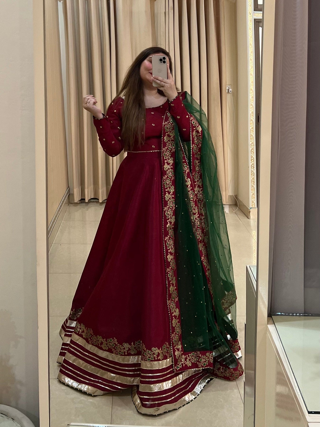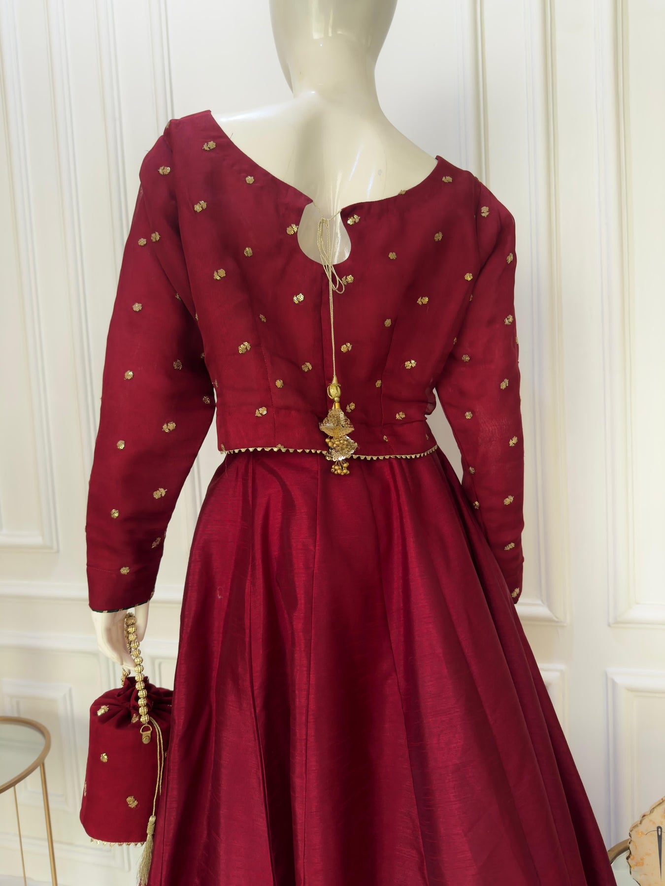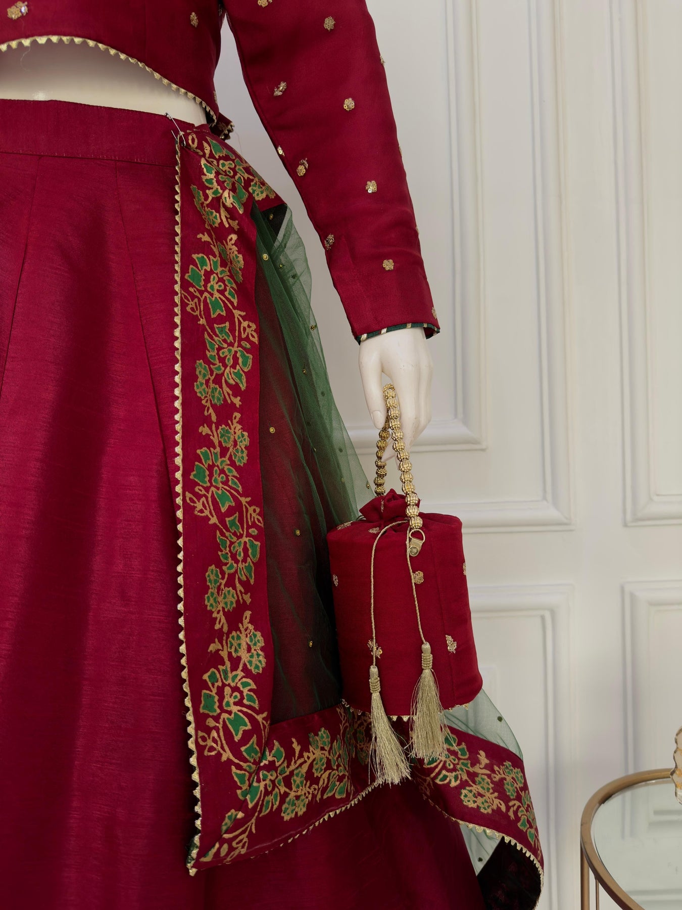Turn heads with Rubi, a stunning red chiffon choli adorned with tilla and sequins, featuring playful tassels at the back. Paired with a voluminous, block-printed and gold lappa lehenga with cancan for added heavy flair and a touch of gotta lace. The look is completed with a net dupatta, beautifully sprinkled with stones and bordered to perfection. Ideal for making a statement at any special event!
