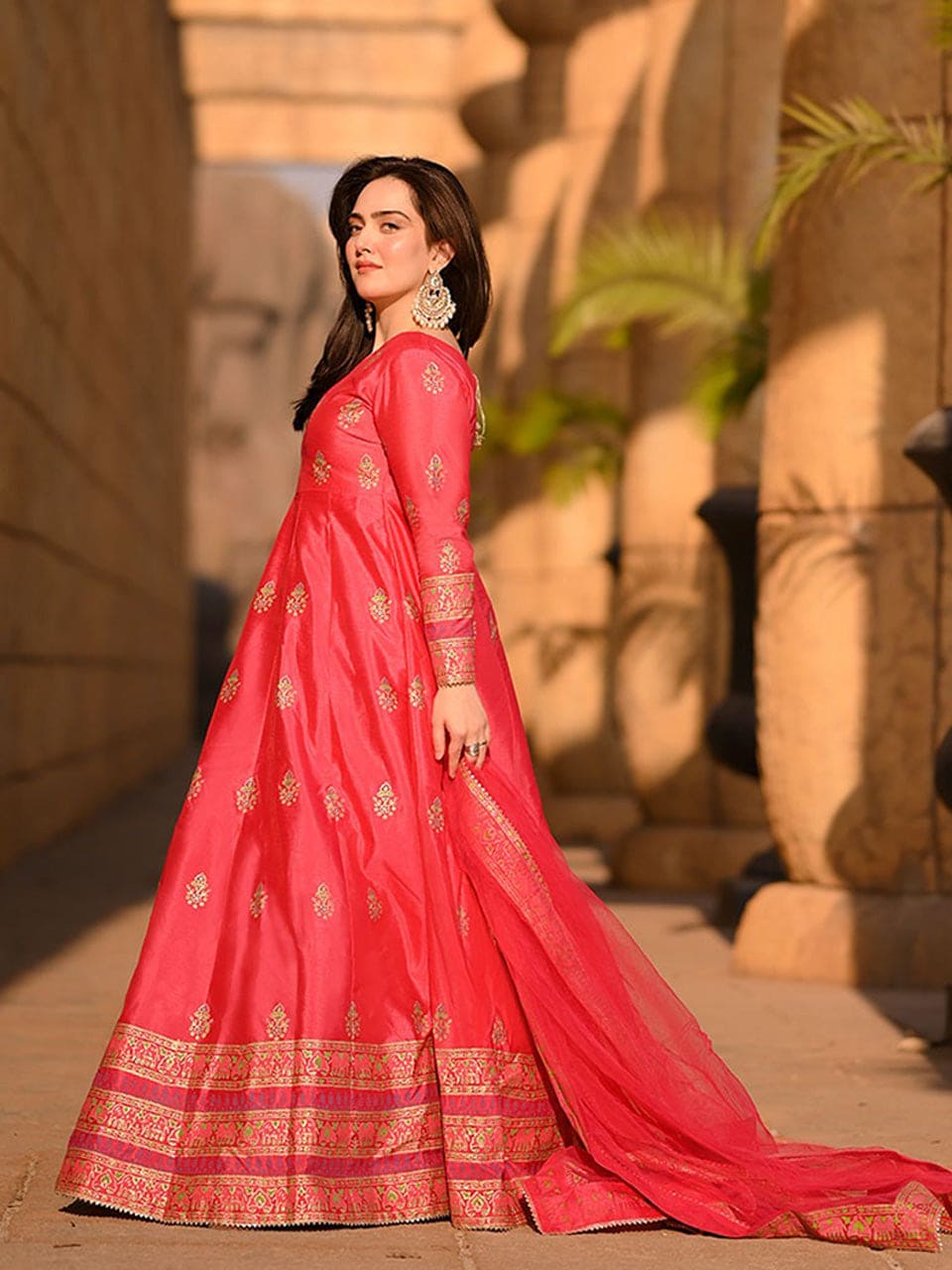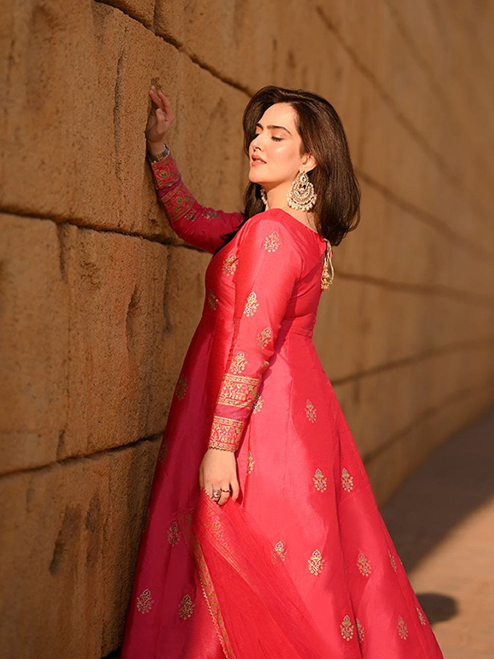 A charming medley of intense pink, this beautiful raw silk maxi is dusted with brilliant gold and multi colors patterns block printed by hand. The tassels hanging from the back of the maxi give it a final touch of elegance. It comes with a net dupatta and an attached cancan to give the dress a voluminous flare.