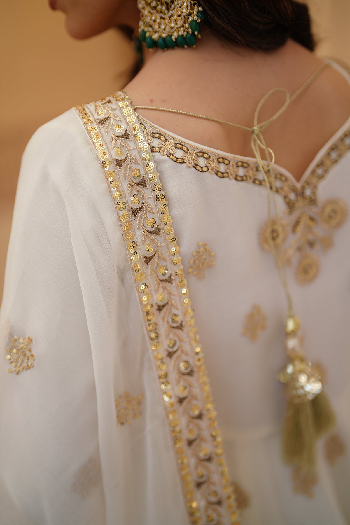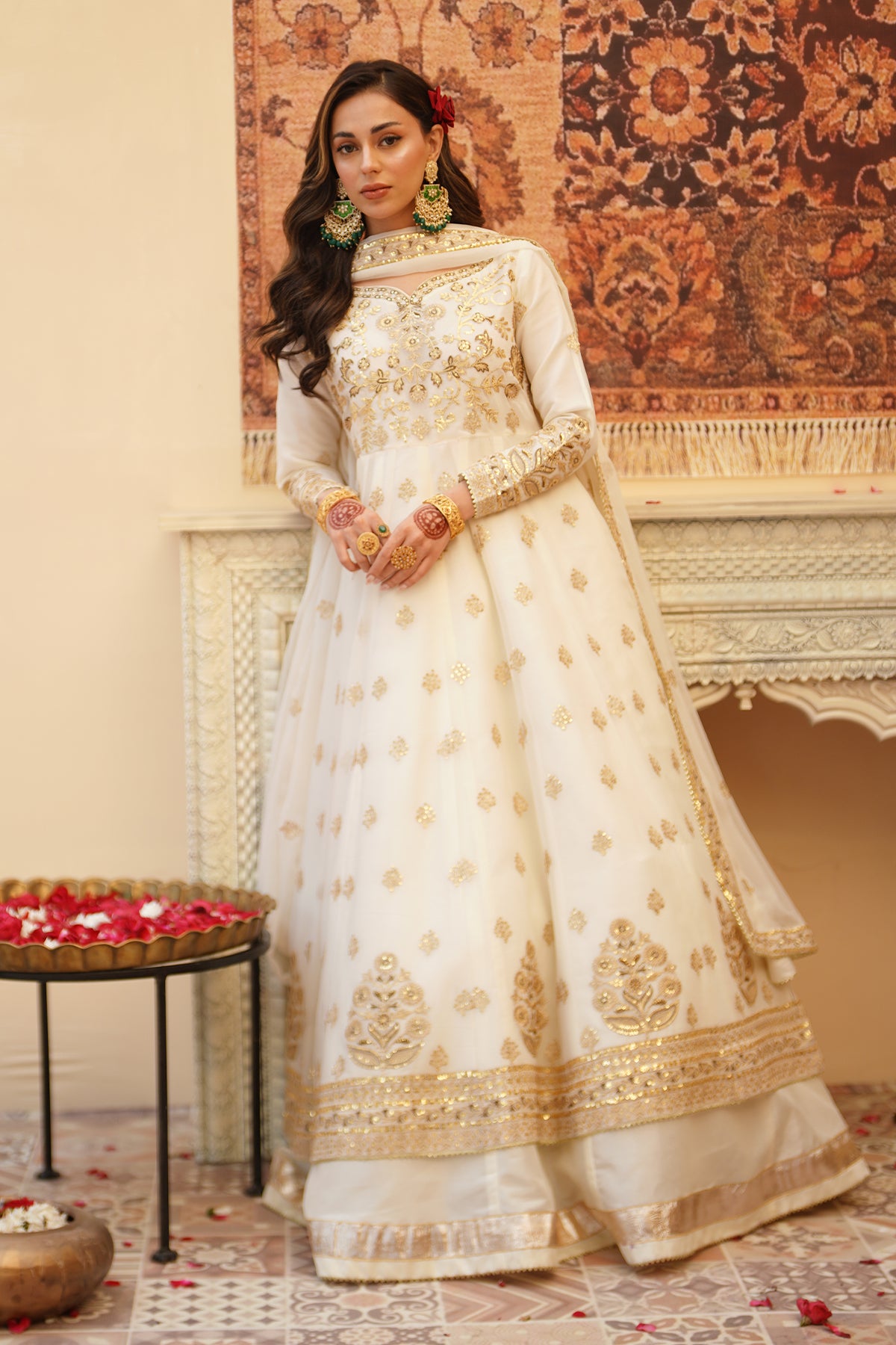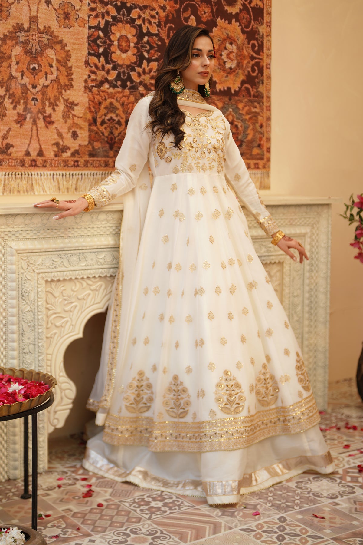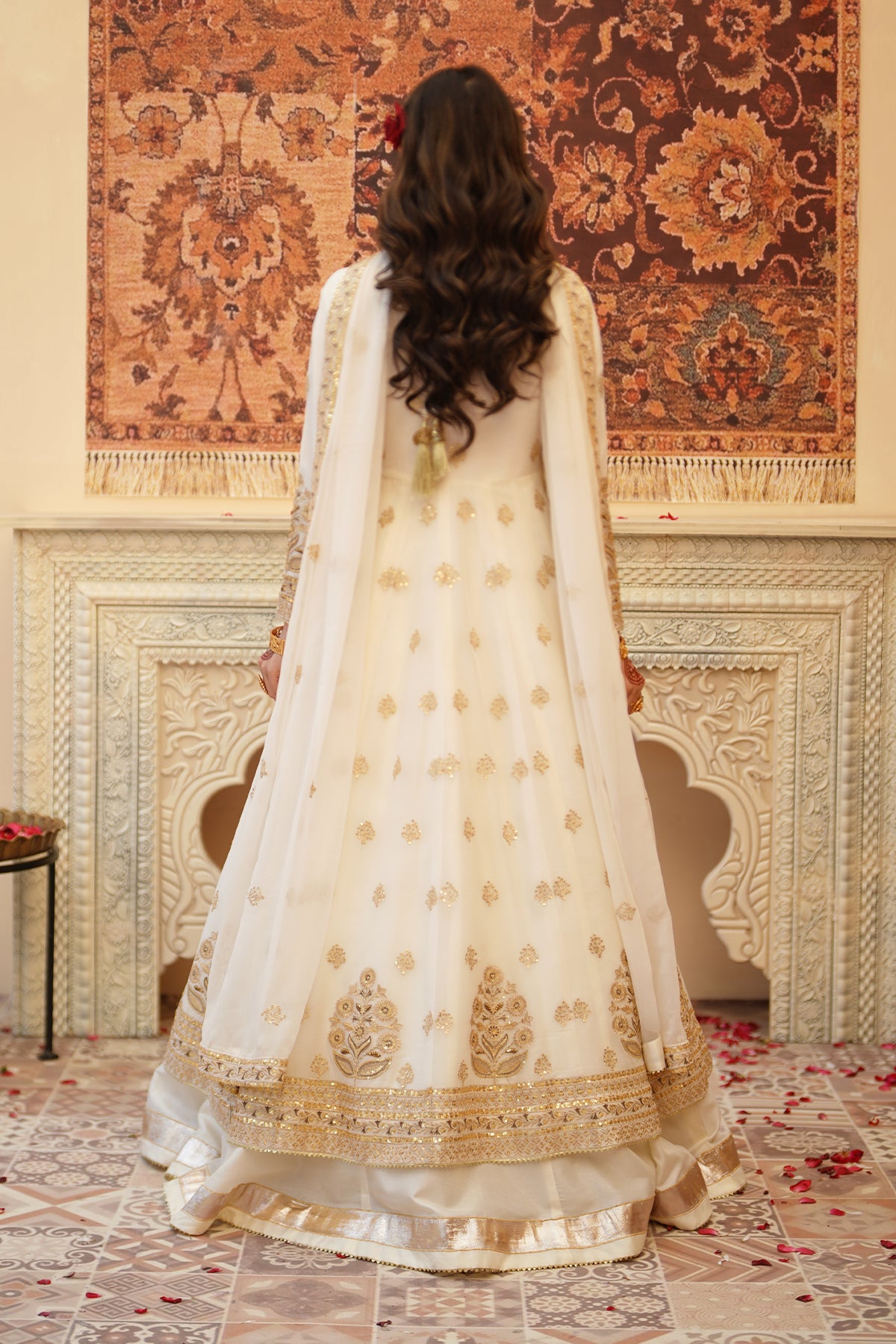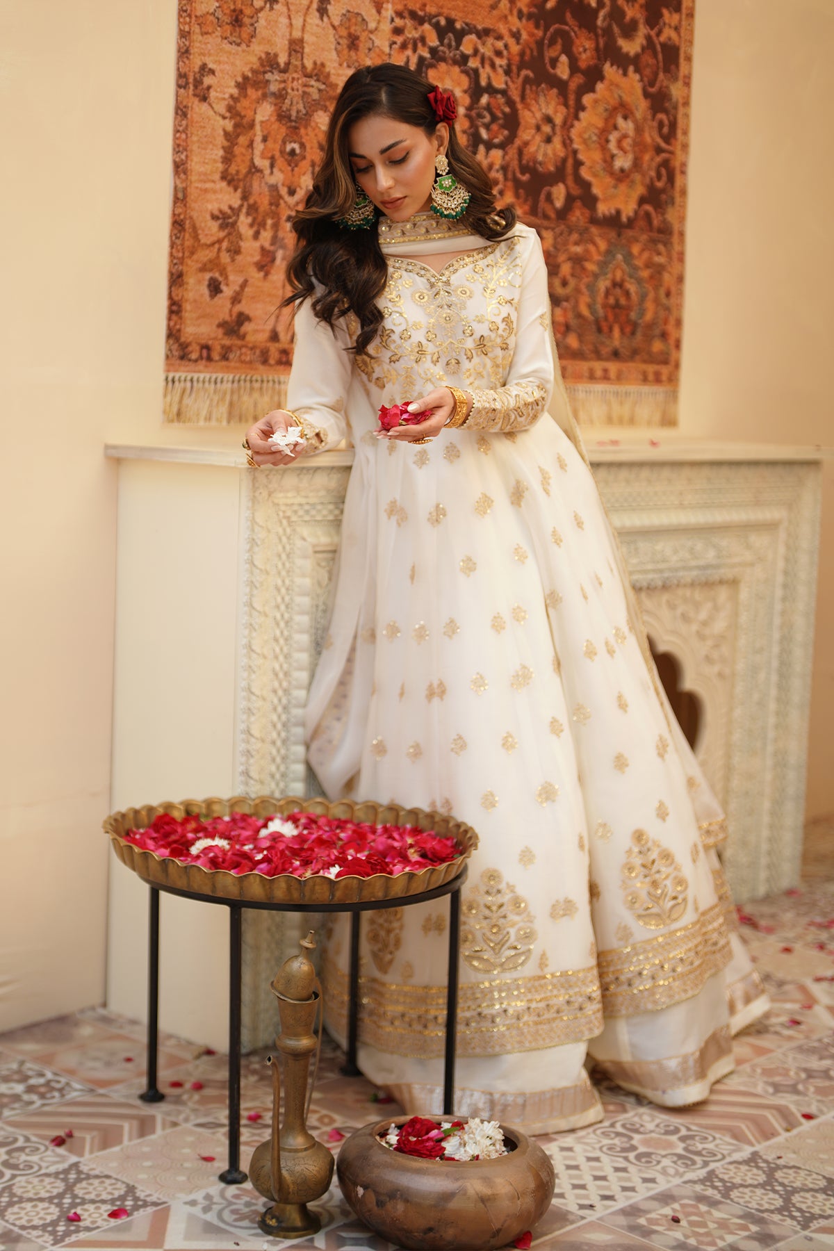 From the SHEHNAI collection, CHAND is an elegant panel frock made with premium chiffon and silk. The 12-panel frock features intricate Embroidery, Tilla , and Sequins detailing with a grand 120-inch flare finished with embroidery and gota work all around. The look is paired with a 3-yard embroidered chiffon dupatta and charming Tassels at the back. It comes with 12 panel lehenga with 172-inch and lappa border on lehenga flare. Cancan attached for heavy flare.