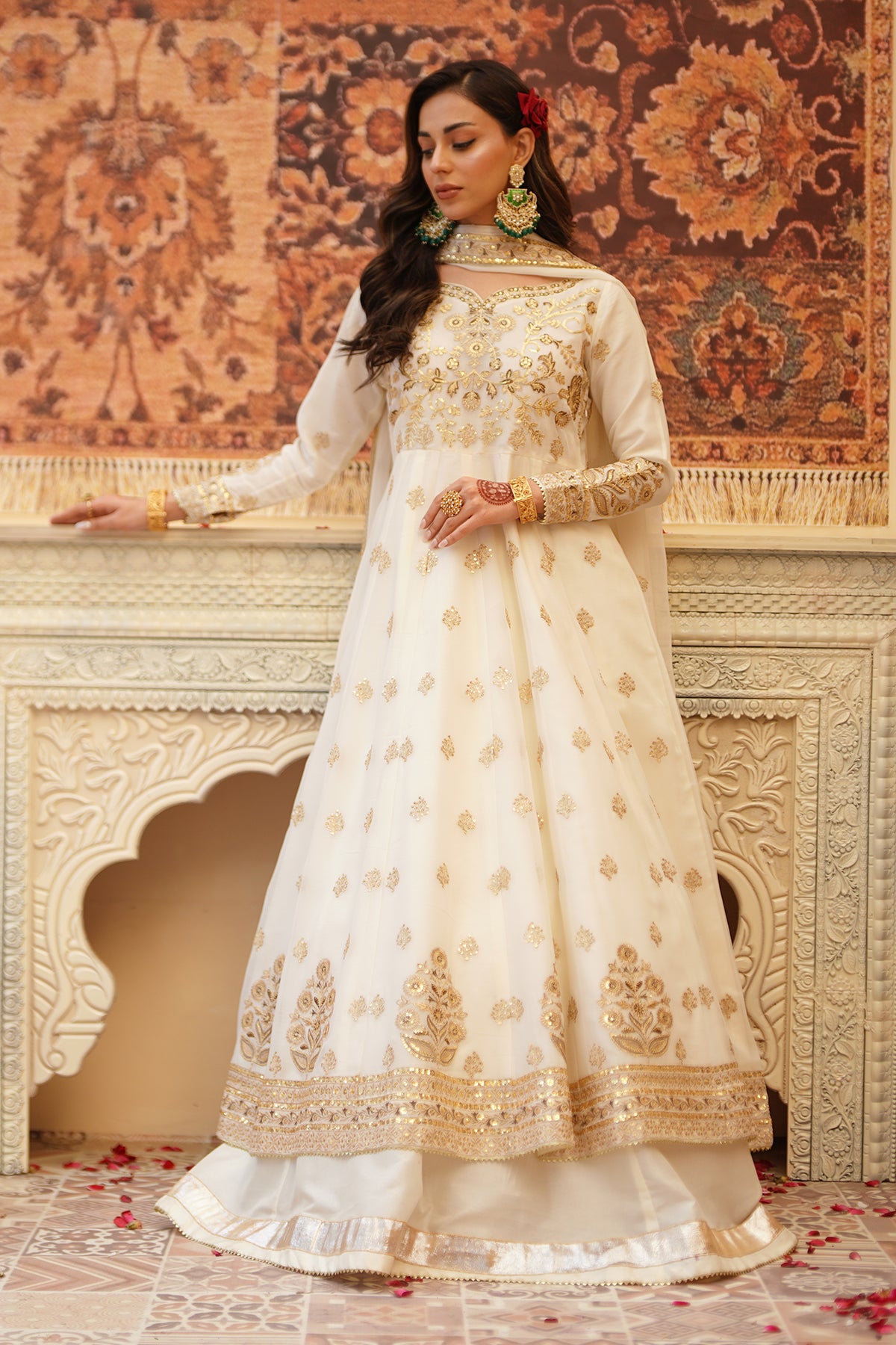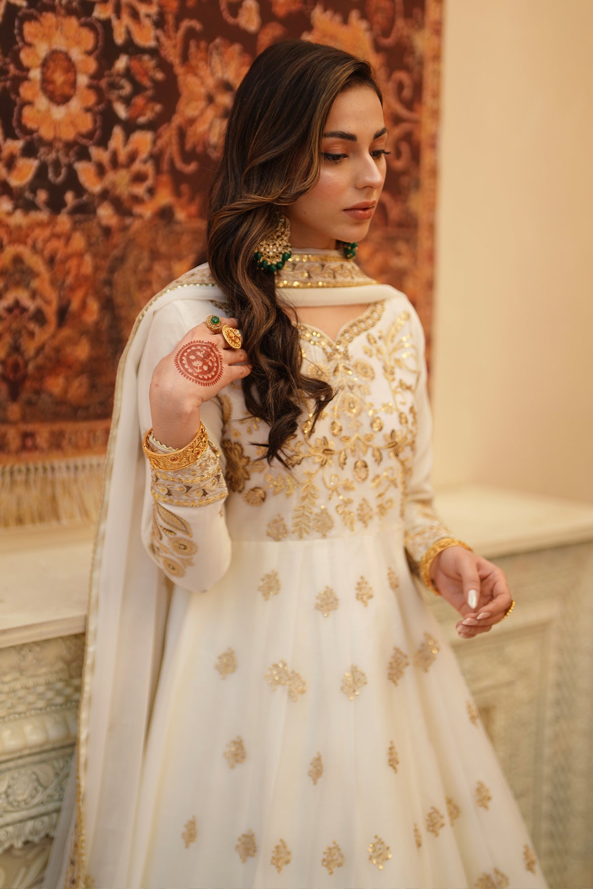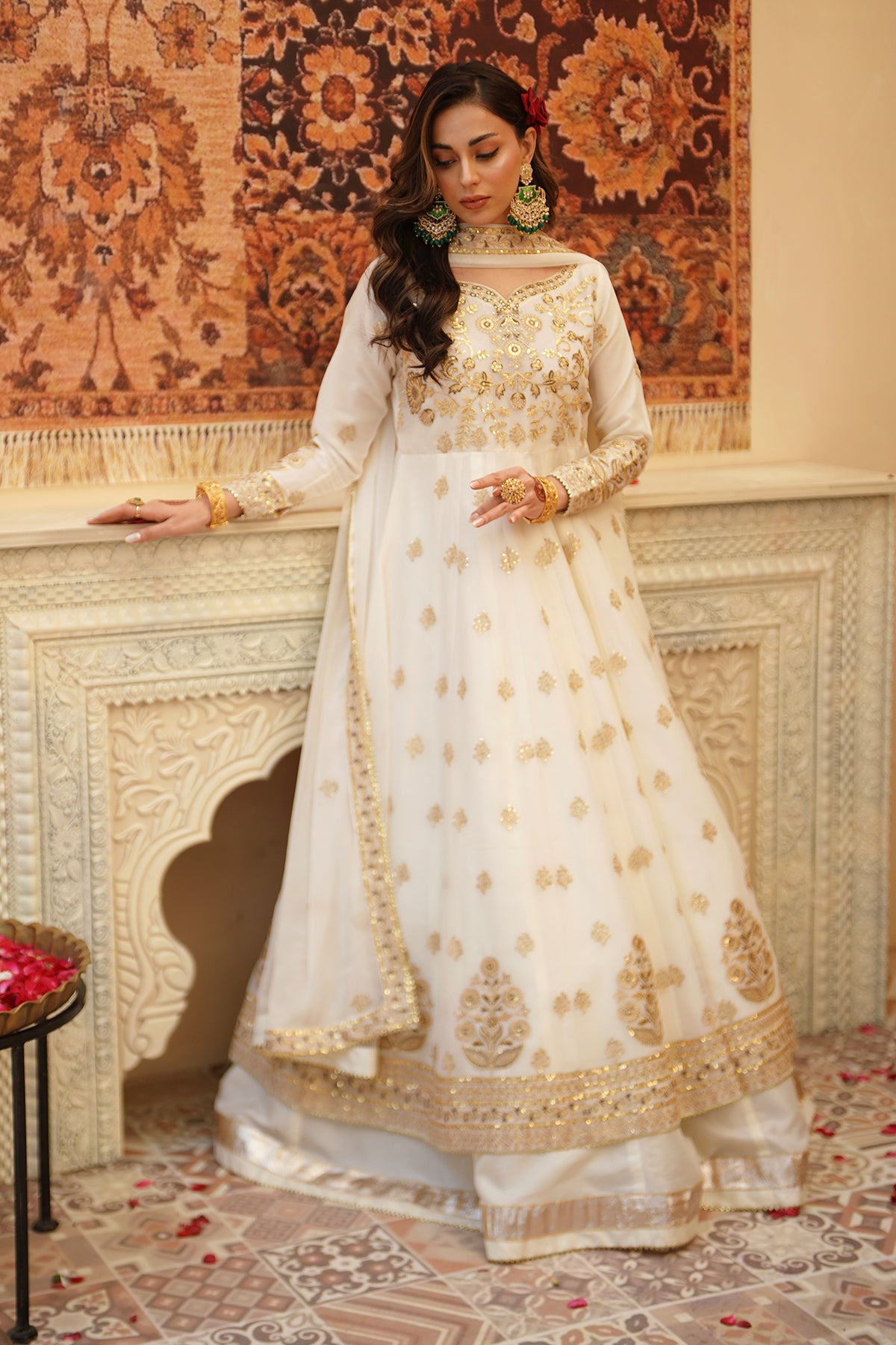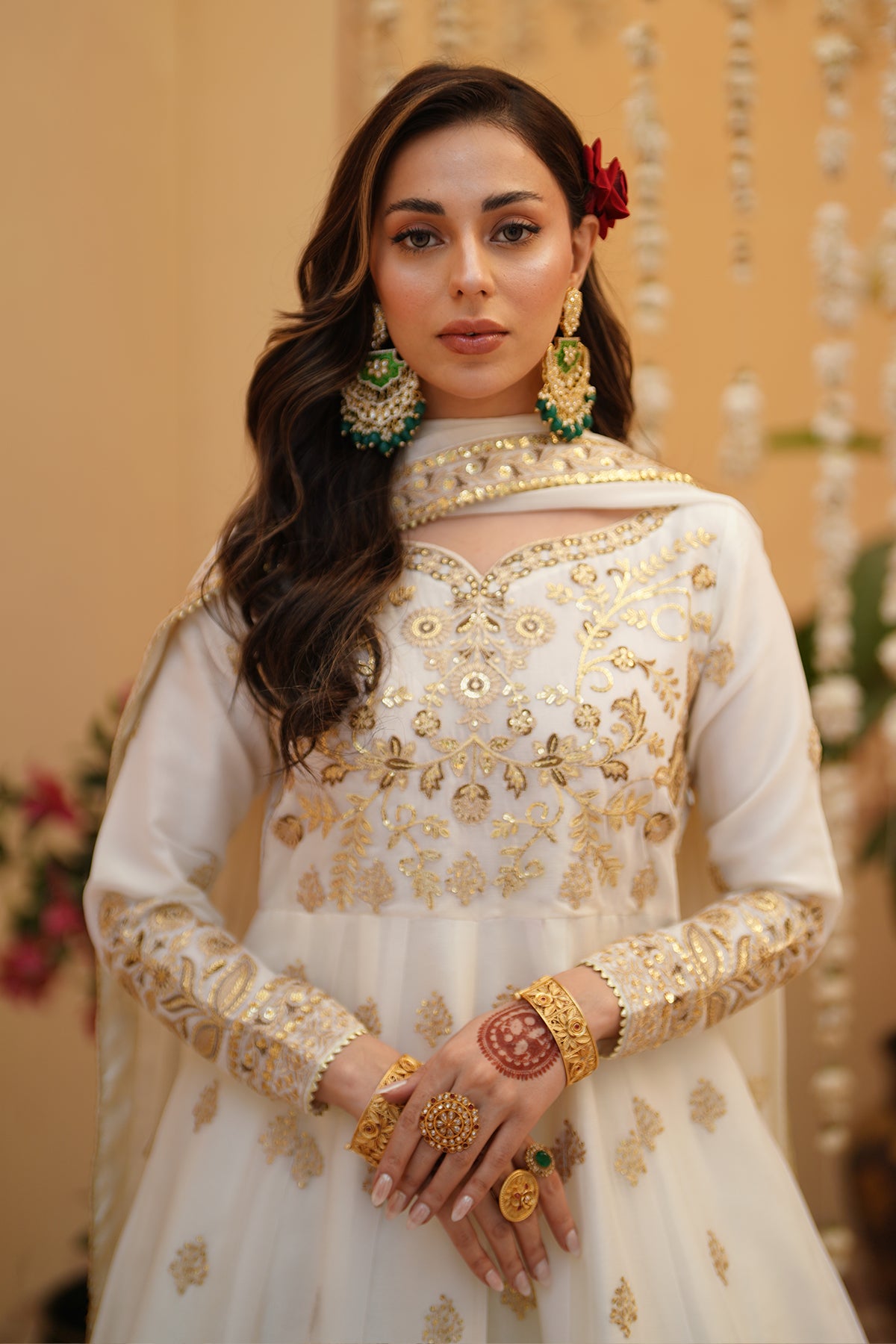 From the SHEHNAI collection, CHAND is an elegant panel frock made with premium chiffon and silk. The 12-panel frock features intricate Embroidery, Tilla , and Sequins detailing with a grand 120-inch flare finished with embroidery and gota work all around. The look is paired with a 3-yard embroidered chiffon dupatta and charming Tassels at the back. It comes with 12 panel lehenga with 172-inch and lappa border on lehenga flare. Cancan attached for heavy flare.