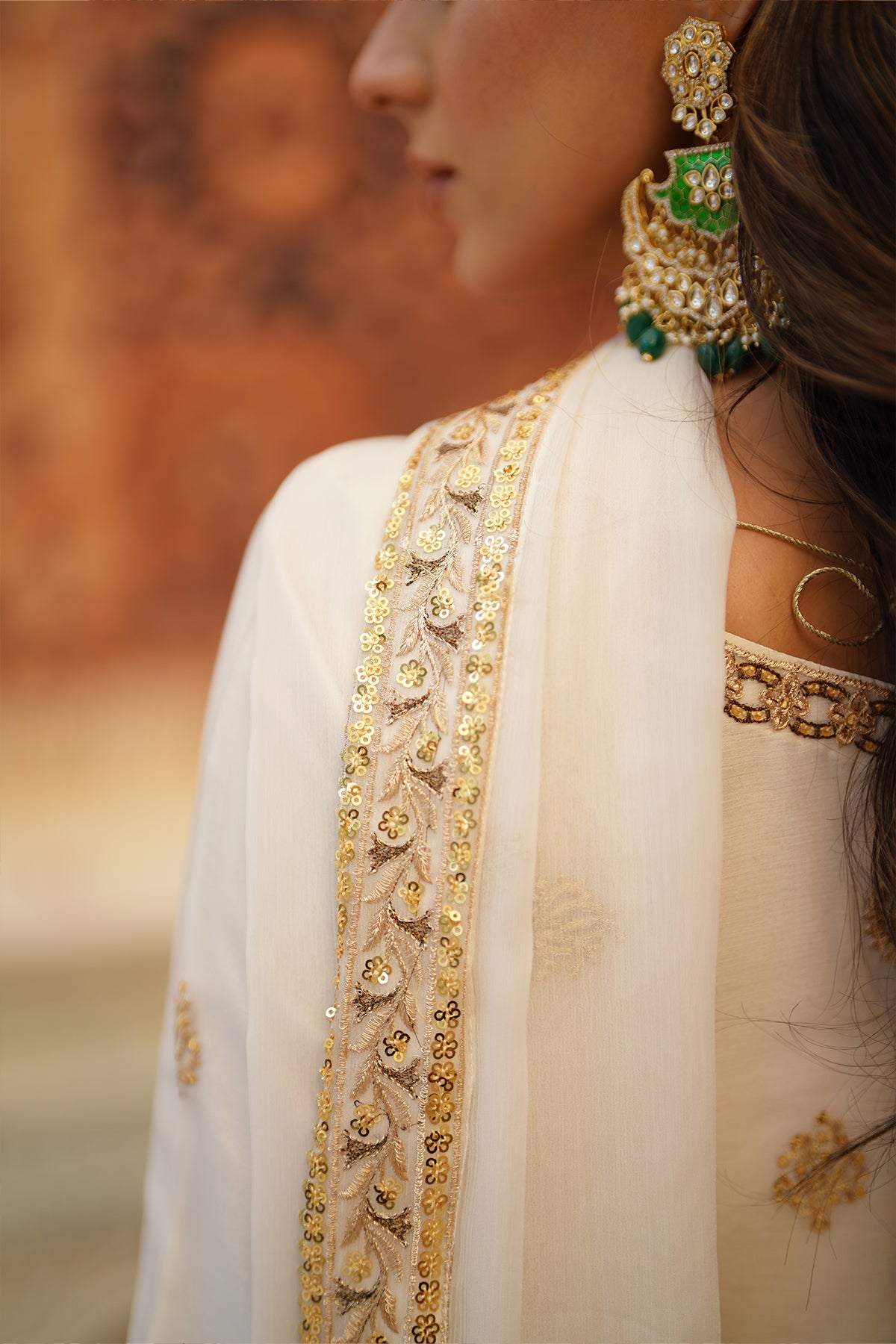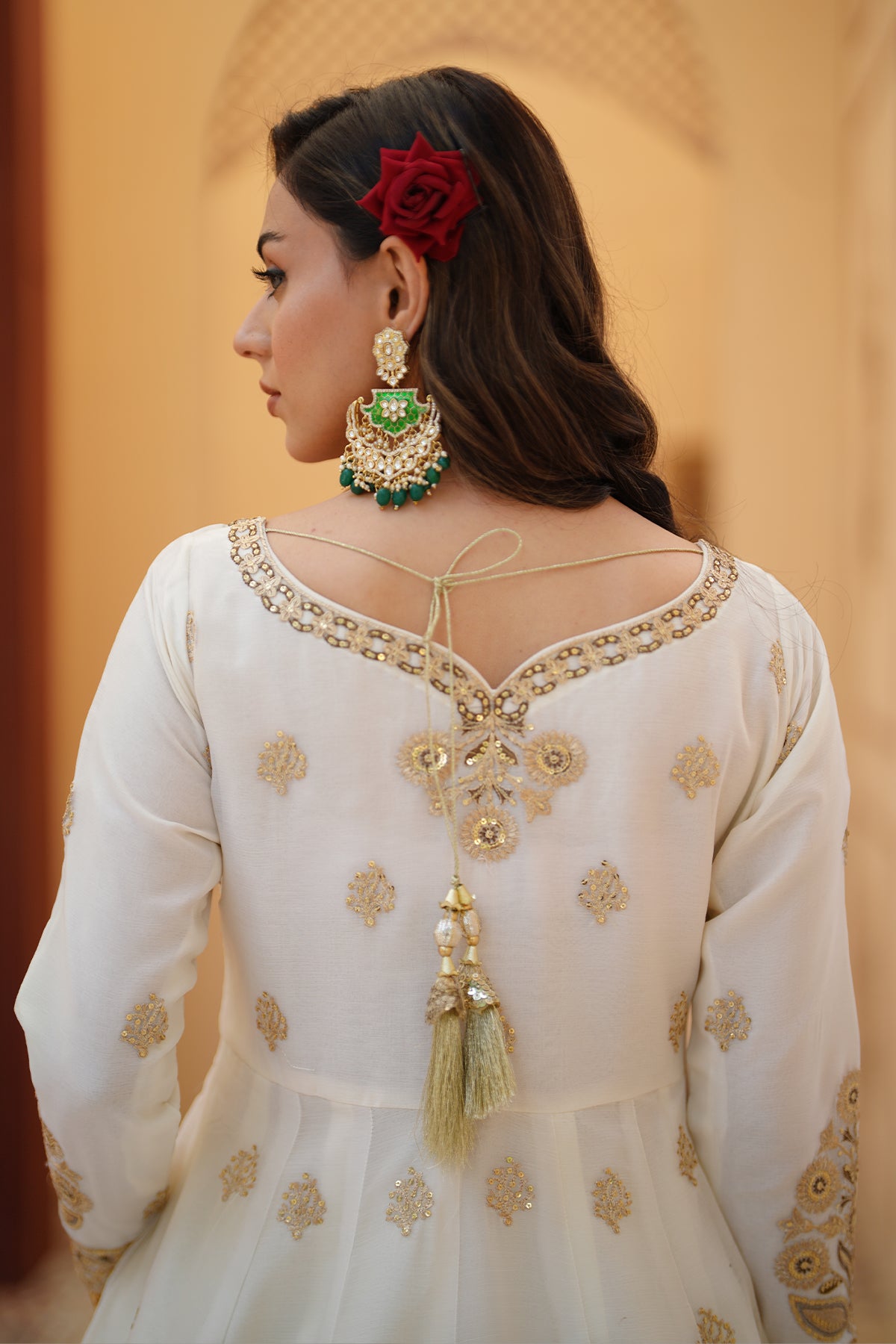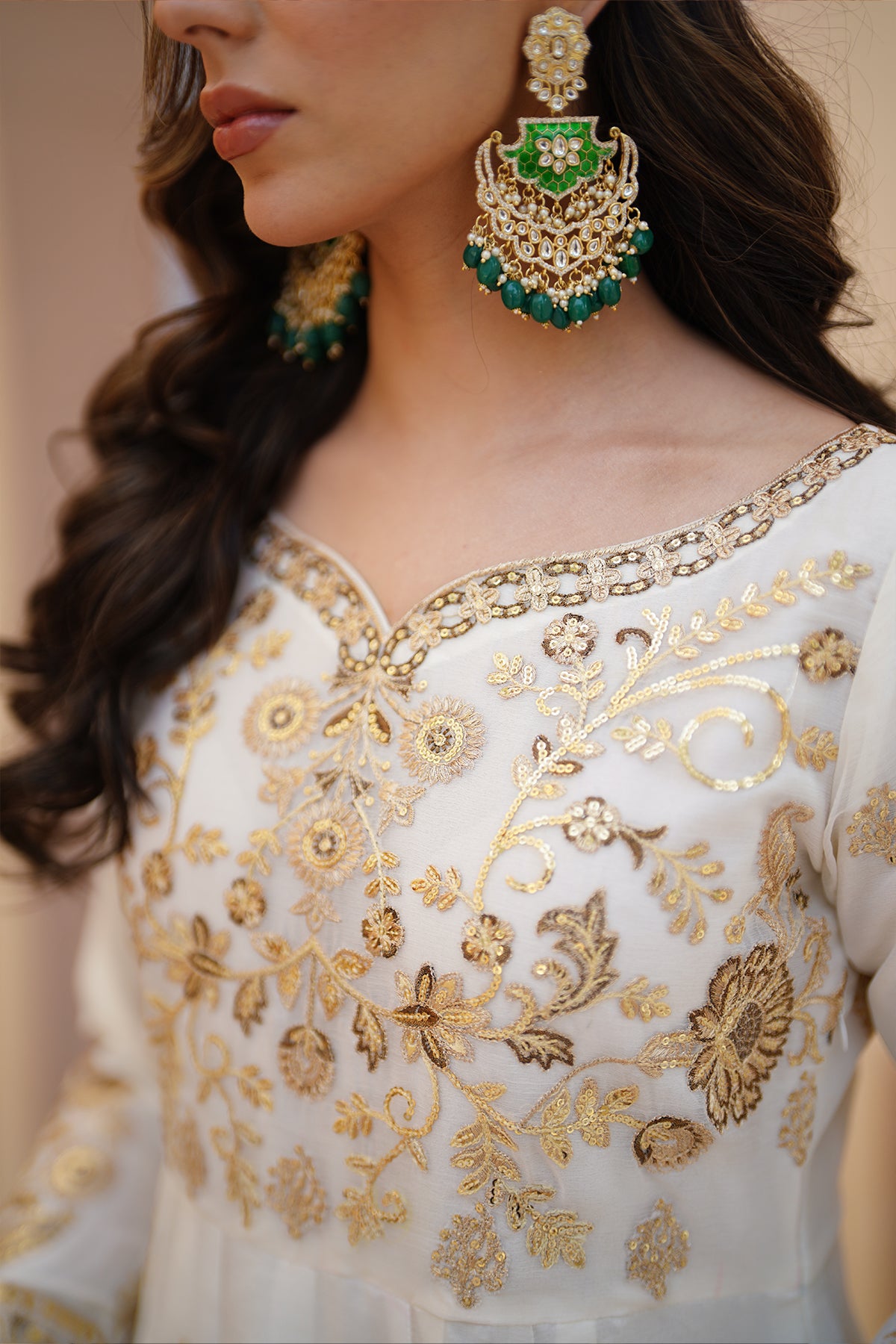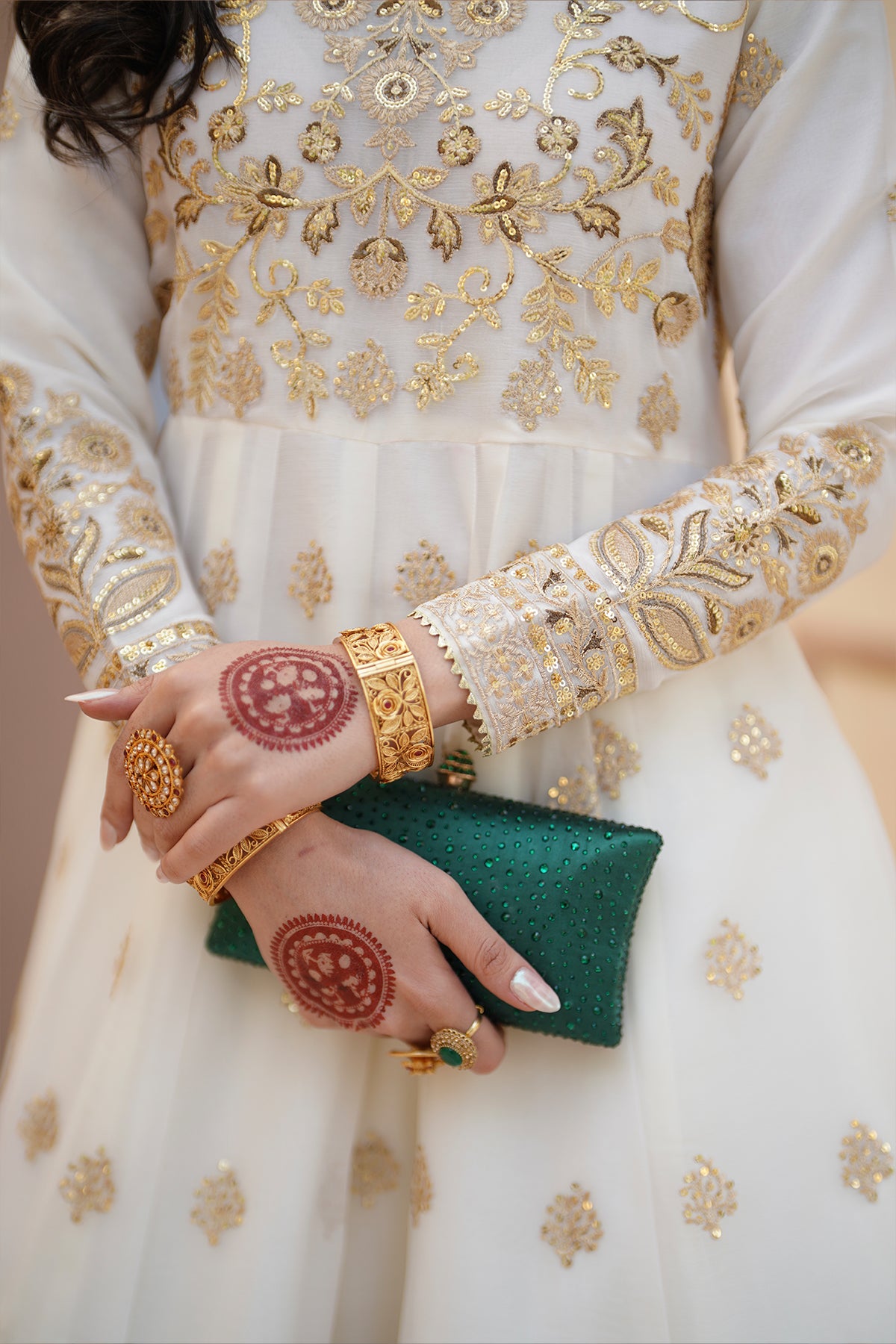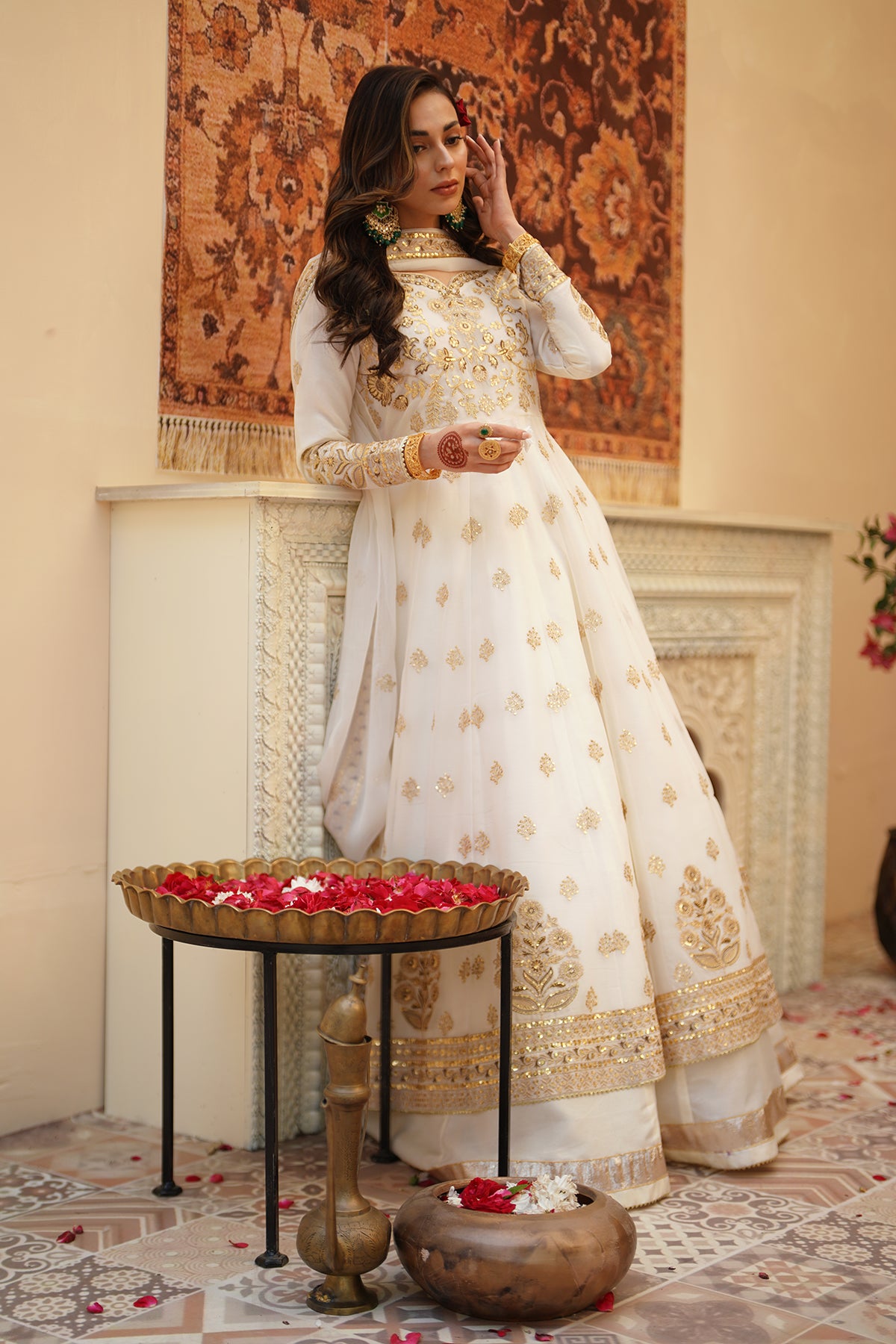 From the SHEHNAI collection, CHAND is an elegant panel frock made with premium chiffon and silk. The 12-panel frock features intricate Embroidery, Tilla , and Sequins detailing with a grand 120-inch flare finished with embroidery and gota work all around. The look is paired with a 3-yard embroidered chiffon dupatta and charming Tassels at the back. It comes with 12 panel lehenga with 172-inch and lappa border on lehenga flare. Cancan attached for heavy flare.