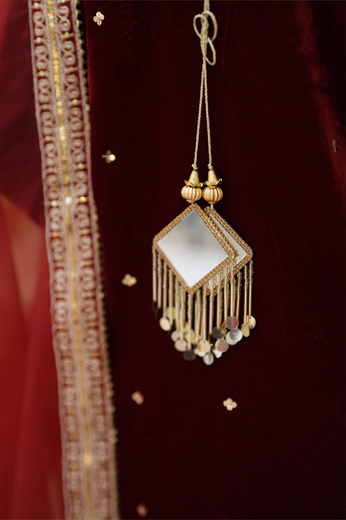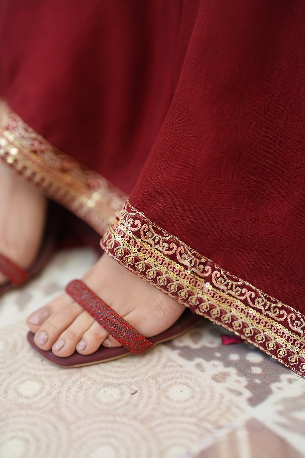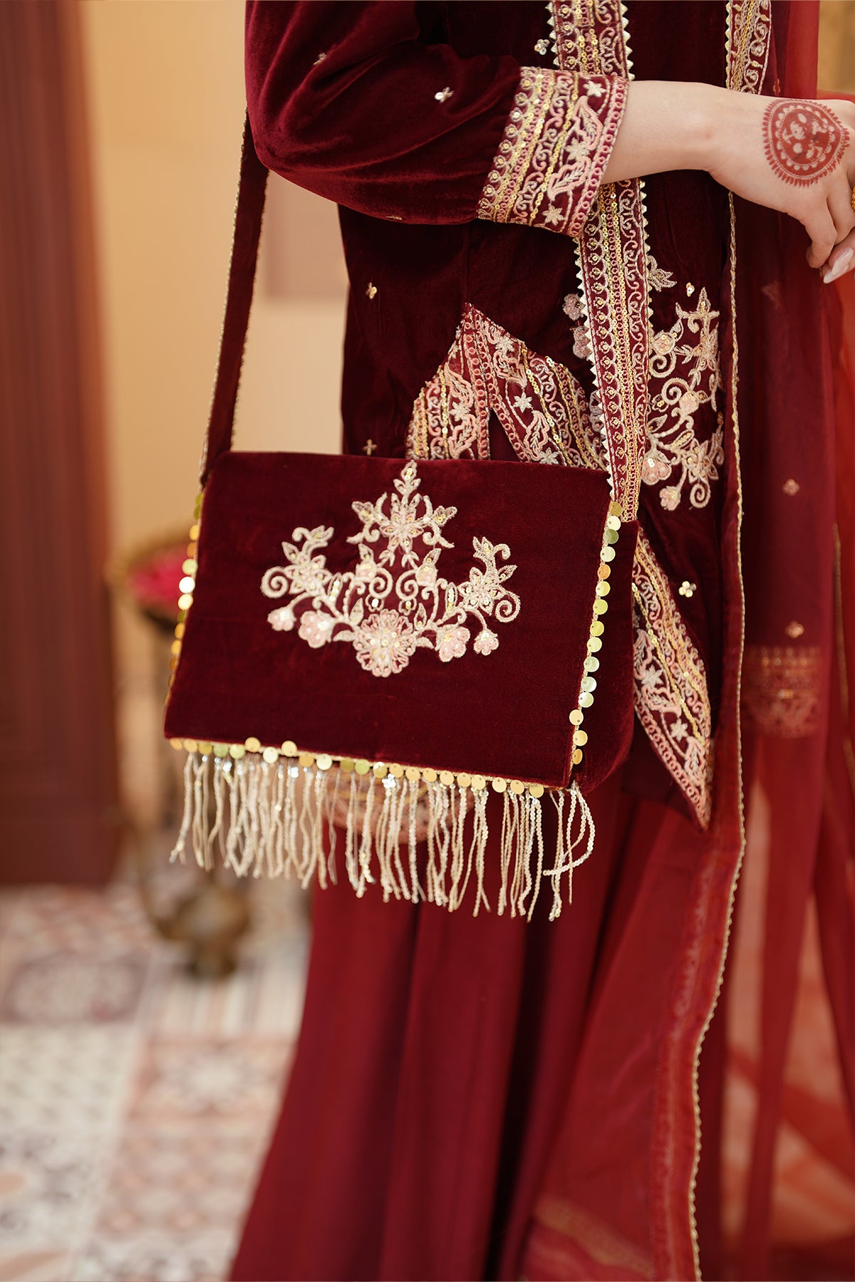 Tilla and Sequins detailing with round daman. Sharara features tilla and sequins border at bottom. The look is paired with a 3-yard embroidered organza dupatta and charming Tassels at the back. A matching bag with long embroidered strap is also available to complete the look.