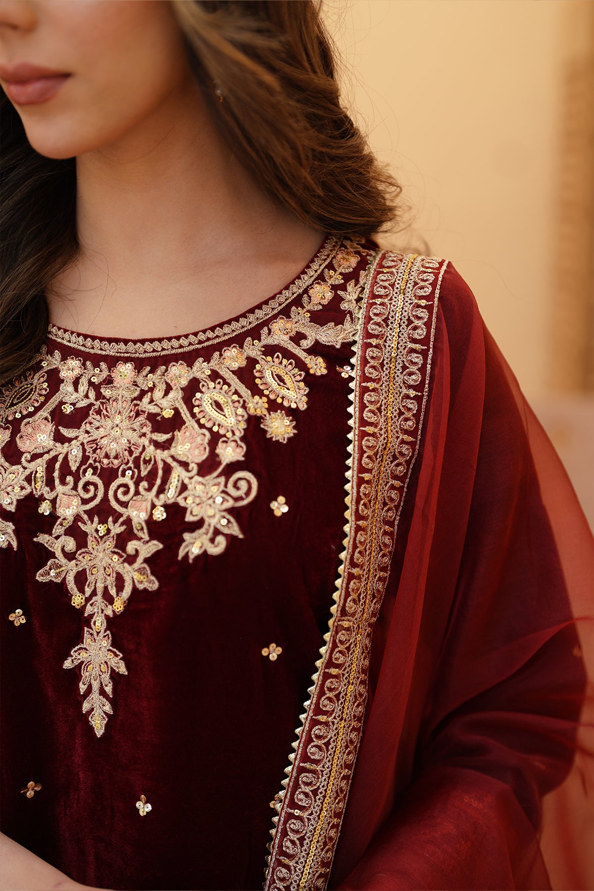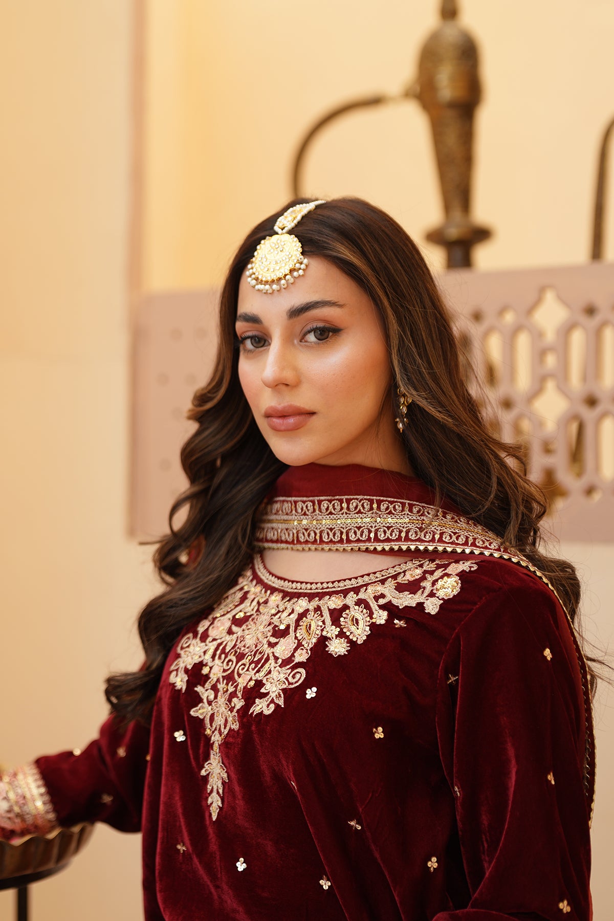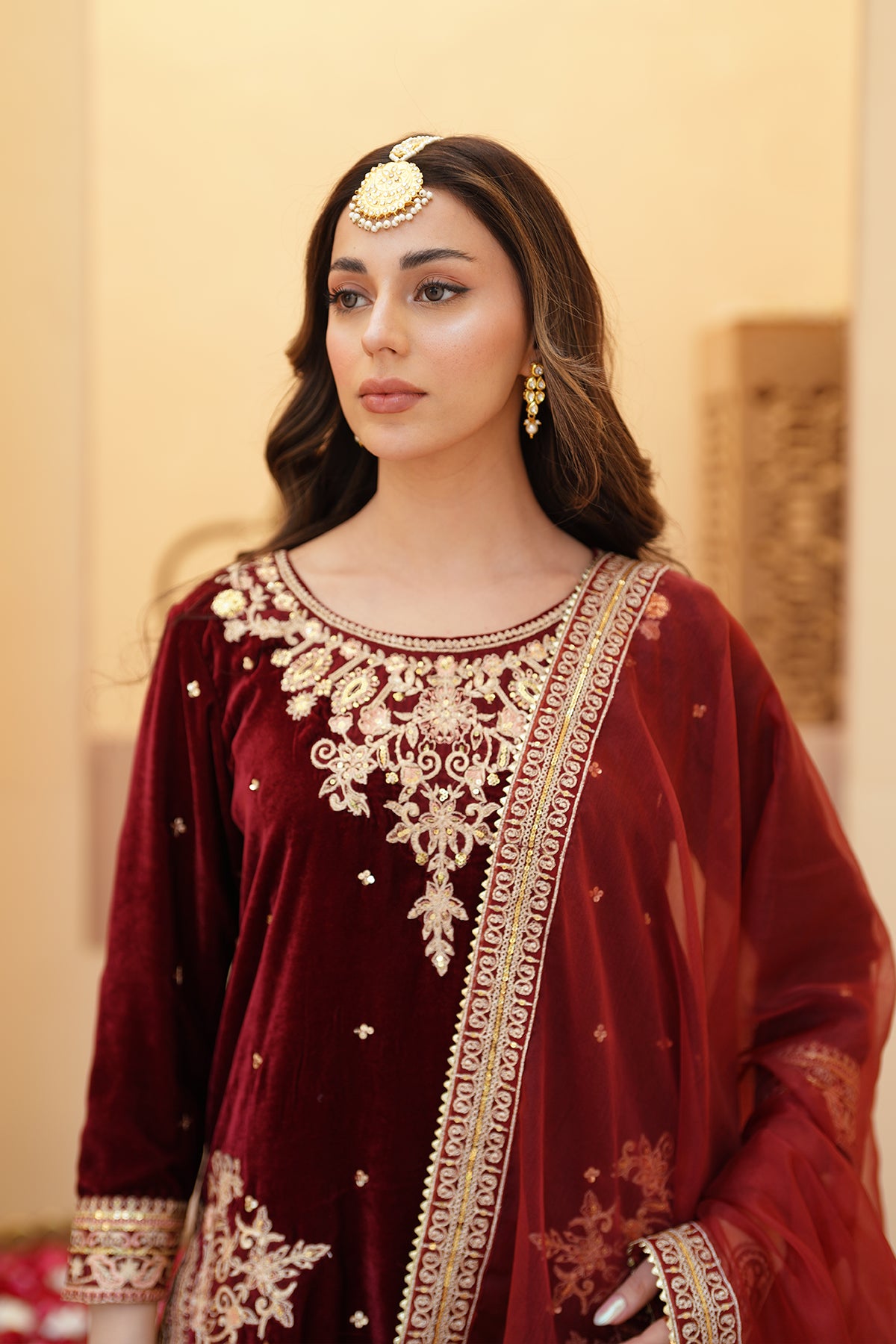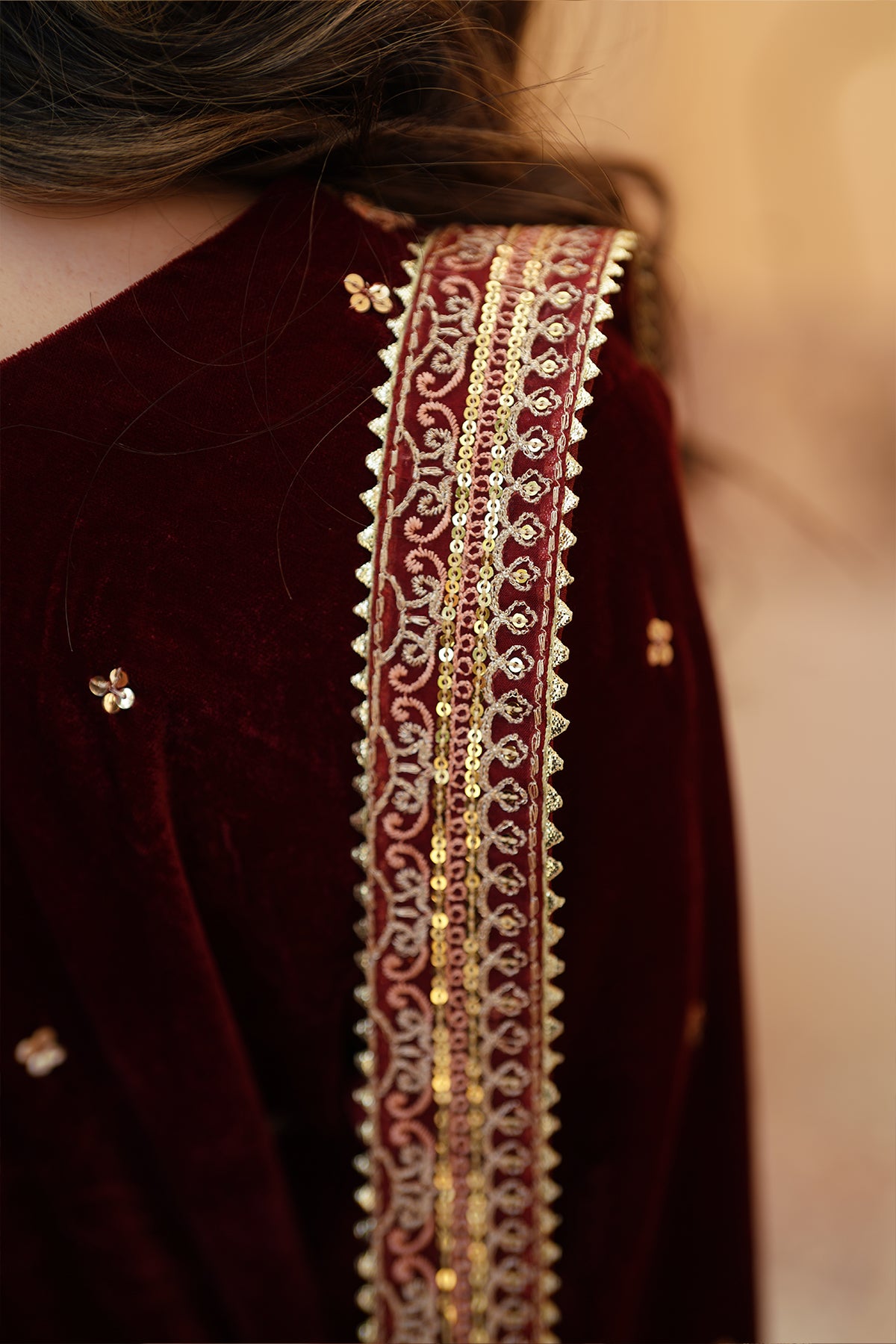 From the SHEHNAI collection, ZEBA is an elegant short Shirt & sharara made with premium velvet and soft raw silk