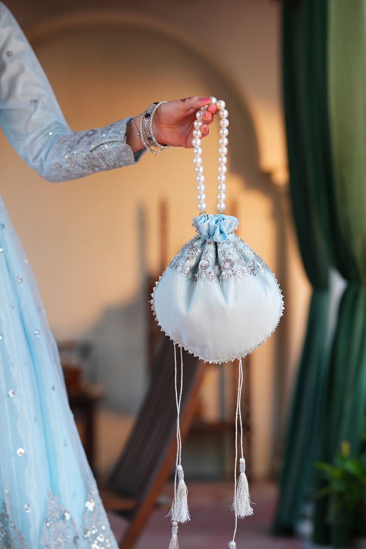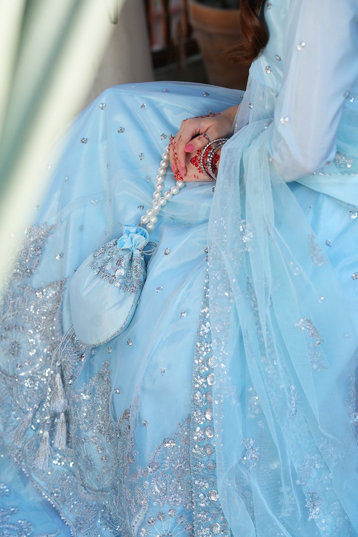 The 12-panel frock features intricate Embroidery, Tilla , and Sequins detailing with a grand 120-inch flare finished with embroidery and gota work all around. The look is paired with a 3-yard net dupatta and charming Tassels at the back. comes with 12 panel lehenga with 172-inch, embroidered border on lehenga flare. Cancan attached for heavy flare. A matching Potli is also available to complete the look.