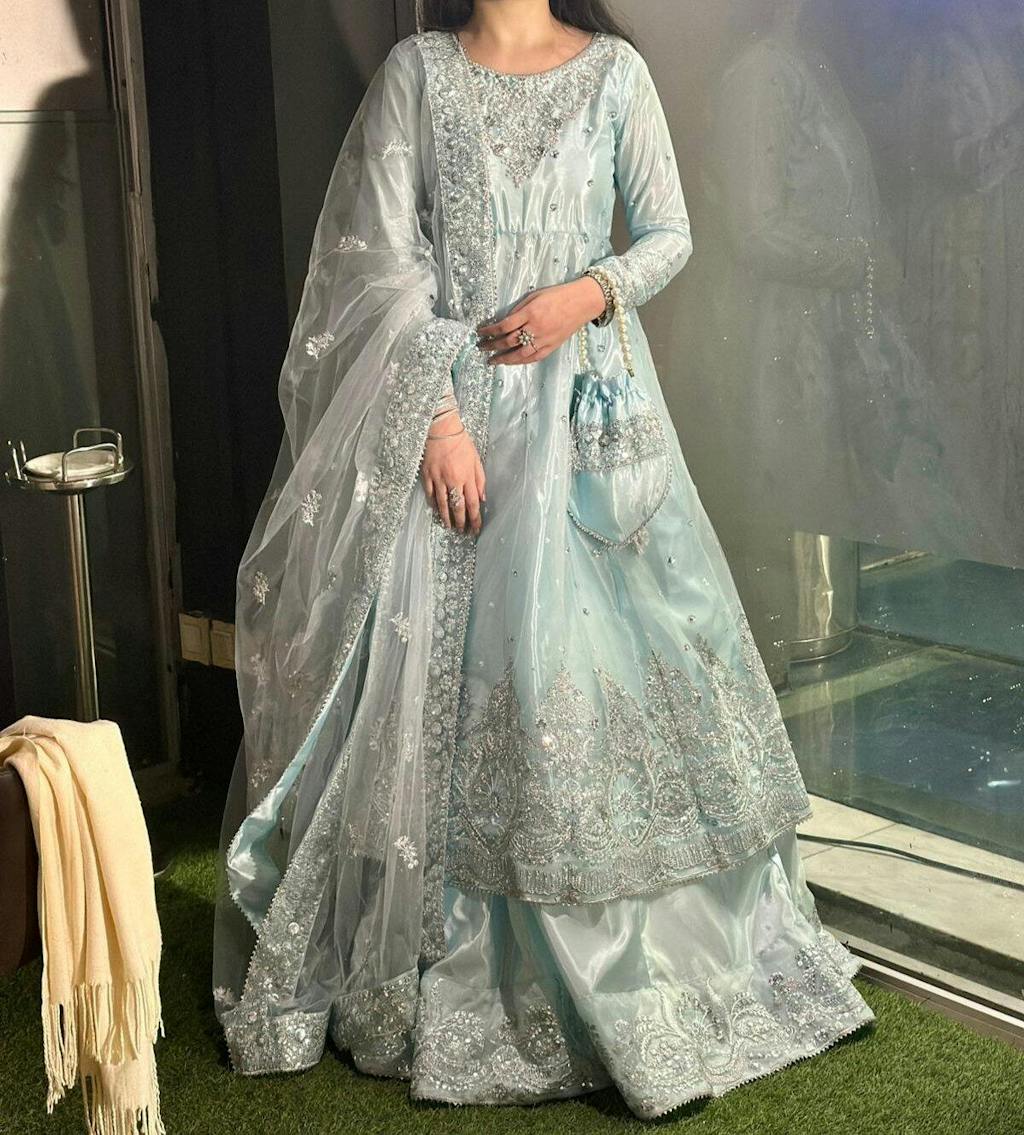 The 12-panel frock features intricate Embroidery, Tilla , and Sequins detailing with a grand 120-inch flare finished with embroidery and gota work all around. The look is paired with a 3-yard net dupatta and charming Tassels at the back. comes with 12 panel lehenga with 172-inch, embroidered border on lehenga flare. Cancan attached for heavy flare. A matching Potli is also available to complete the look.