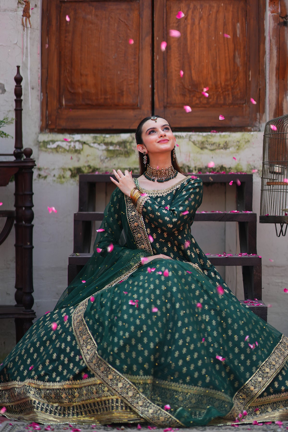The 16-panel maxi Neckline, Sleeves , and flare features intricate gotta, sequins and embroidery detailing with a grand 240-inch flare. The look is paired with a 3-yard net dupatta and charming tassels at the back. Maxi has screen print spray all over.