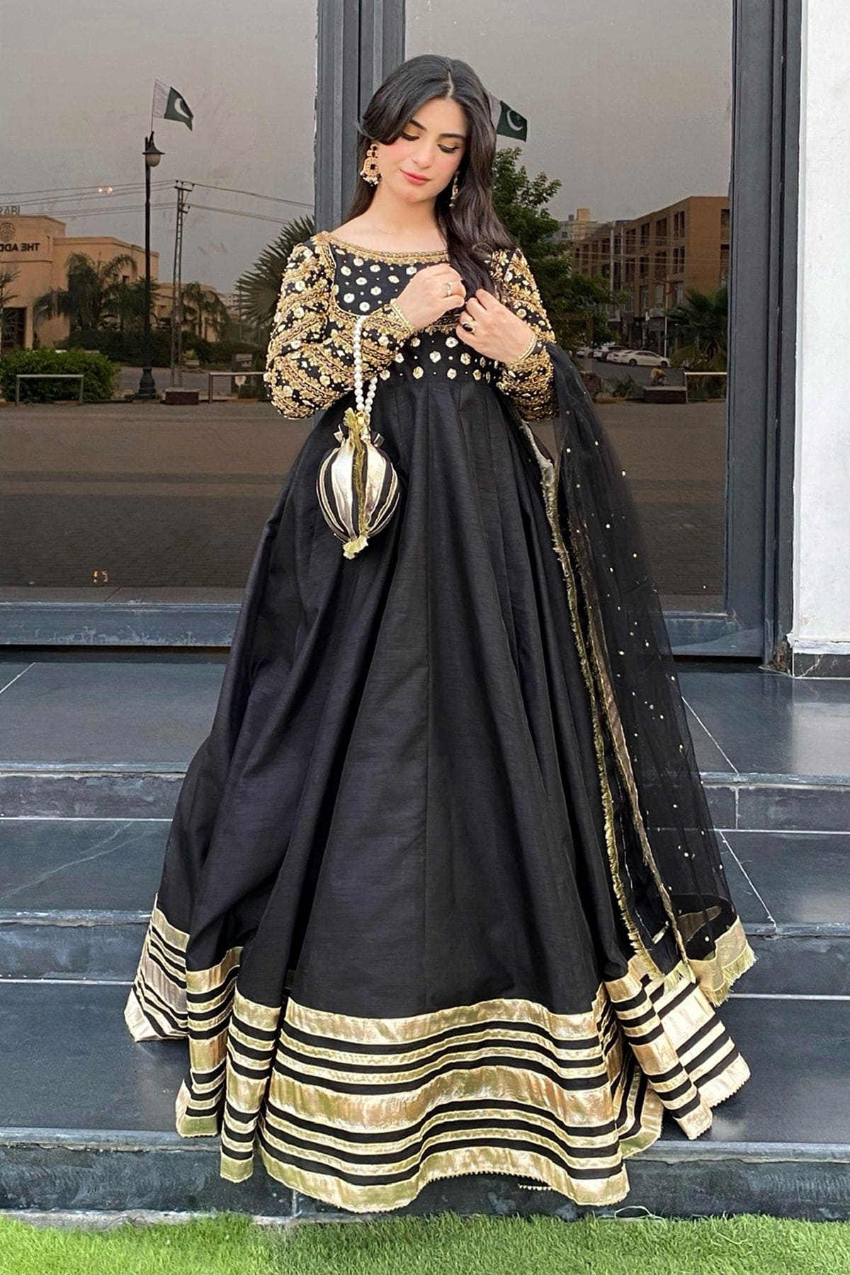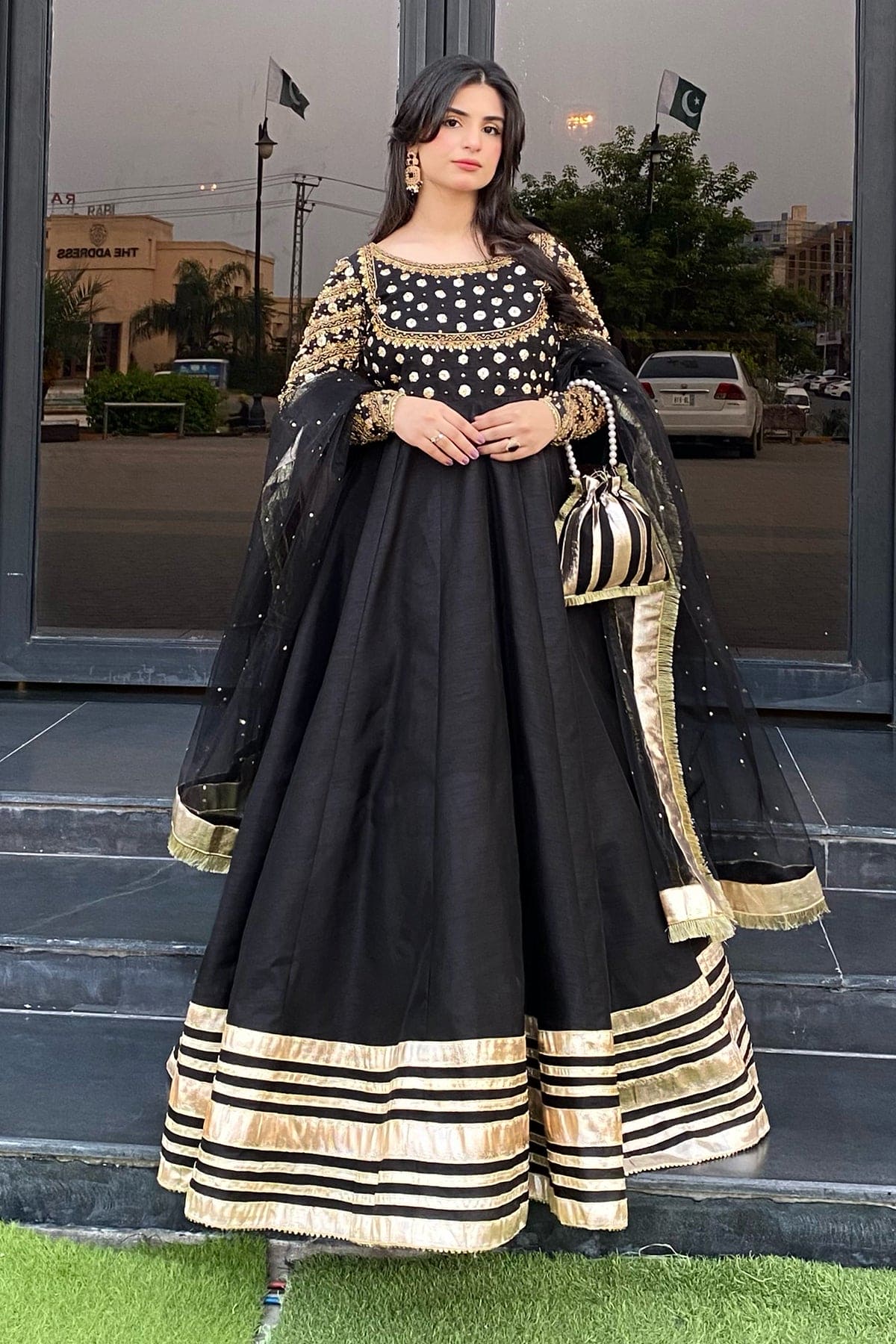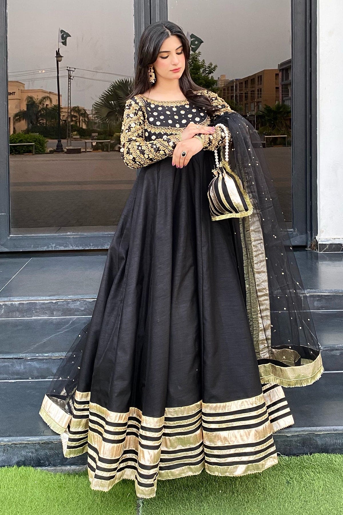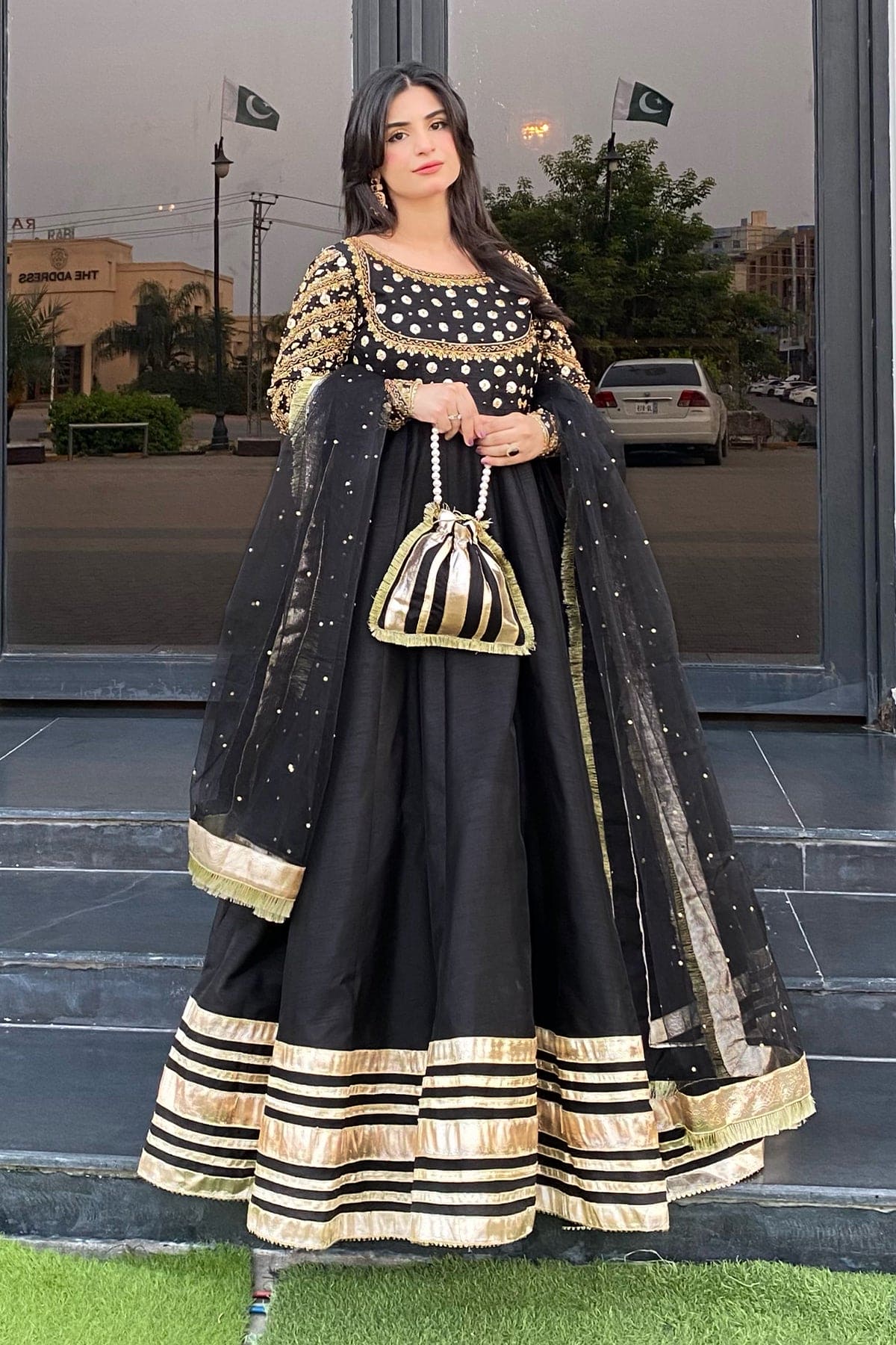 The 16-panel maxi features intricate handwork, gotta, and lappa detailing with a grand 240-inch flare finished with lappa work all around. The look is paired with a 3-yard net dupatta and charming tassels at the back. A matching potli is also available to complete the look.
