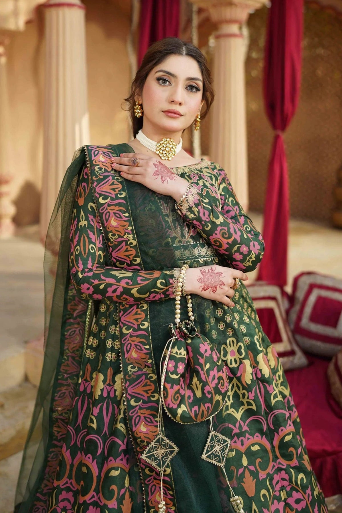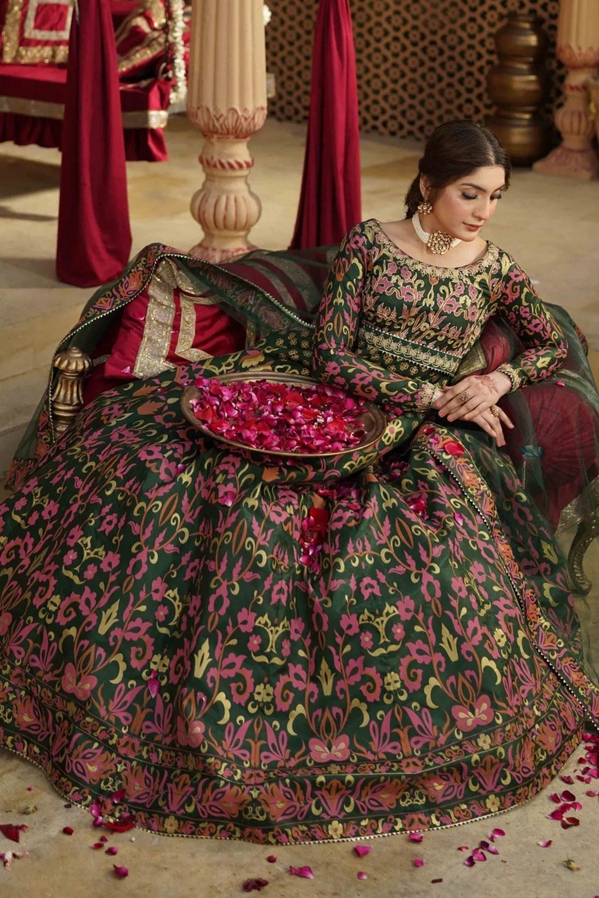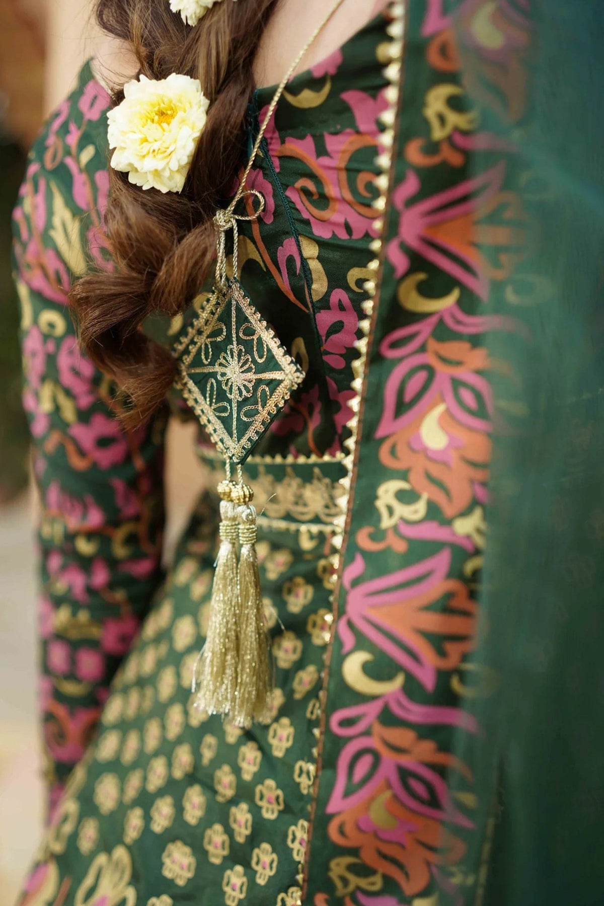 "Gul" is a gorgeous outfit made with delicate kattan silk, designed as a long maxi dress. The detailed Tilla embroidery on the sleeves and front bodice gives it a classy and sophisticated look. It comes with a cancan for a graceful flare and a net dupatta. Adorned with Screen Print and gotta lace on the maxi and all four sides of the dupatta borders. The ensemble includes a cute pouch and hand-made tassels at the back and separate embroidered waist belt for that extra special touch. Perfect for weddings, "Gul" is a standout piece that beautifully blends traditional elements with a modern style, making it a must-have for any special event. #Gul #GulPosh #EasternFusion #EmbrioderyDetails #ScreenPrinting