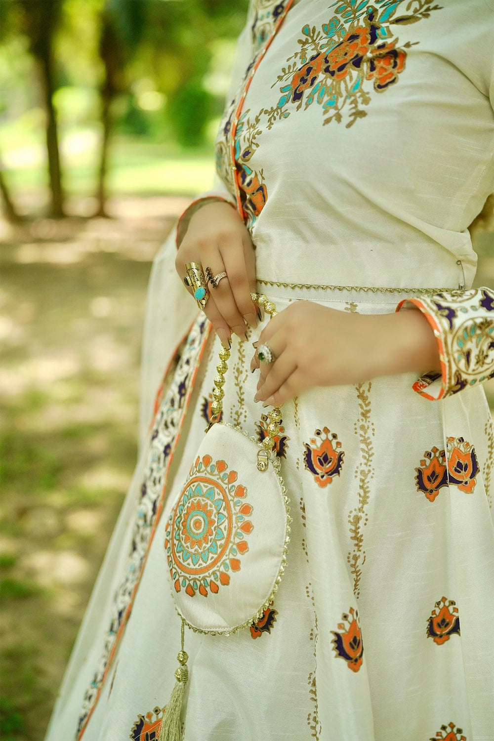 ‘DIYA’ Step into elegance with this stunning black dress ‘DIYA’! Made from luxurious raw silk, it features exquisite machine tilla embroidery on the neckline and sleeves, created using the hand block technique. The hand block print on the lehenga flare adds a touch of traditional charm. Cancan attached for nice volume. The gotta lace on the choli and lehenga flare beautifully complements the overall design. With a back zip adorned with tassels, it's both stylish and convenient. The cancan attached gives the lehenga flare a graceful volume. The net dupatta with stone details and printed border with gotta lace completes the ensemble perfectly. Plus, it comes with a separate pouch, making it ideal for weddings and festive occasions. This dress will make you the center of attention. Shine bright and make a statement with this gorgeous black dress!" #Diya #GulPosh #EasternFusion #EmbrioderyDetails #HandBlockPrinting